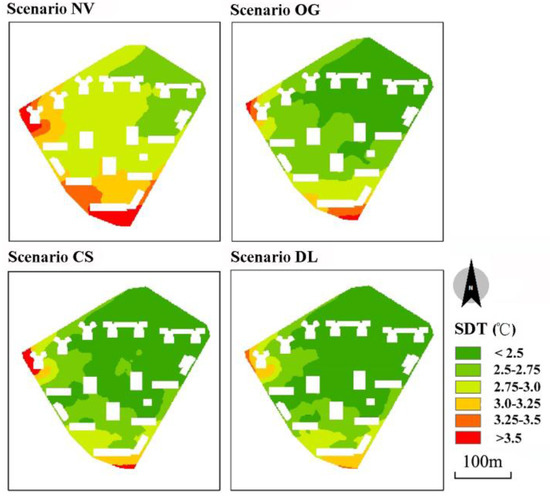 Standard deviation is a commonly used measure that quantifies the amount of variation or dispersion of a set of data values. Higher standard deviation indicates that the data points are spread out over a wider range. We used the spatial statistics tools in ArcGIS 9.3 (Esri Inc., Redlands, CA, USA) to calculate the standard deviation of air temperature (SDT) of each grid in modeled area during 8:00–20:00 to understand the influences from vegetation on air temperature (Figure 7). Scenario NV clearly showed higher SDT than other three scenarios. With the addition of vegetation, the area with highest SDT (>3.5 °C) gradually decreased and disappeared in scenario CS and DL, while the percentage of area with smallest SDT (<2.5 °C) expanded considerably from zero in scenario NV to 43%, 62% and 65% in scenario OG, CS and DL respectively. The results implied that in addition to lower air temperature, vegetation could also lead to a more stable thermal environment with smaller temperature variation.