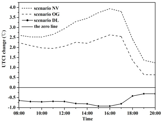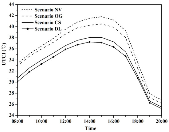 We calculated UTCI using the outputs derived from ENVI-met to investigate the change of outdoor thermal comfort status of whole WCY (Figure 8) from 8:00 to 20:00. The UTCI of the CS (base case) varied from 19.87 °C to 45.58 °C, and scenario NV and OG showed 2.8 °C and 1.9 °C, respectively higher on average than the base case (Figure 9). When compared the base case with degradation scenarios on a grid level, the magnitude of cooling was notably larger than at the whole modelled area scale due to the shading effects of trees, which can provide an approximately 10 °C cooler thermal environment in contrast with the bare soil situation in scenario NV. Trees with denser canopy can intercept more solar radiation and mitigate the thermal stress during summer daytime, which is supported by our results that scenario DL was 0.67 °C cooler on average than the base case.