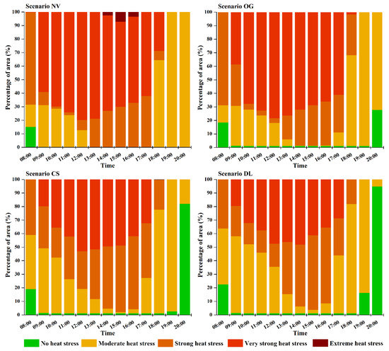 From the base case, it is explicitly shown that almost the whole WCY was under thermal stress of different levels from 9:00 to 19:00. Areas with no heat stress only exist at morning time in a small proportion (19.2%) and after the sunset (approximately at 19:15). The results demonstrated that during the summer day, people can only enjoy outdoor spaces of WCY before 9:00 and during the evening hours after 19:00. Compared with the base case, the areas of scenario NV and OG that suffered from strong thermal stress were reduced during 10:00 to 16:00, while the area exposed to more severe heat stress level (very strong heat stress) showed a noticeable increase from 8:00 to 19:00, which indicated that the outdoor thermal environment was deteriorating. For scenario NV, a small area of WCY even experienced extreme thermal stress during the period of 14:00 to 16:00 (Figure 10). This illustrated that the number of hours and area of the studied quarter that can be enjoyed by residents were further reduced in the two degradation scenarios. Doubling trees LAD profiles resulted in a decrease in area suffered from strong thermal stress and very strong thermal stress and an increase in area under no thermal stress and moderate thermal stress, indicating tree played an important role in mitigating thermal environment due to its denser canopy, which could shelter more solar radiation from ground surfaces.