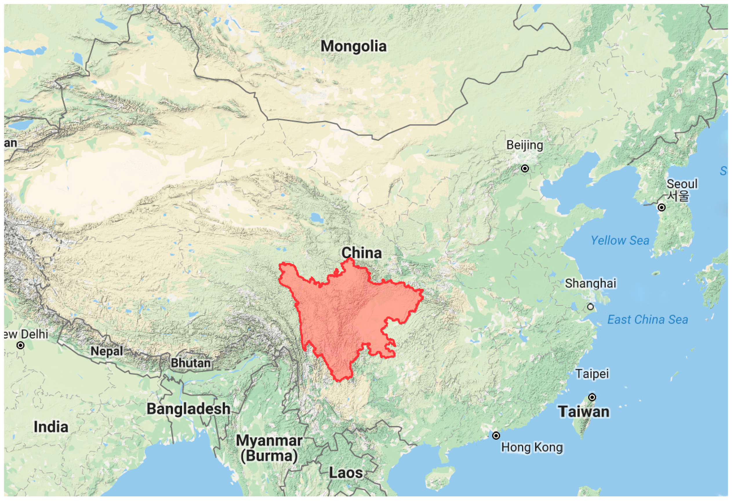 Partial map of China (the area in red is Sichuan Province, which located in southwest China).
