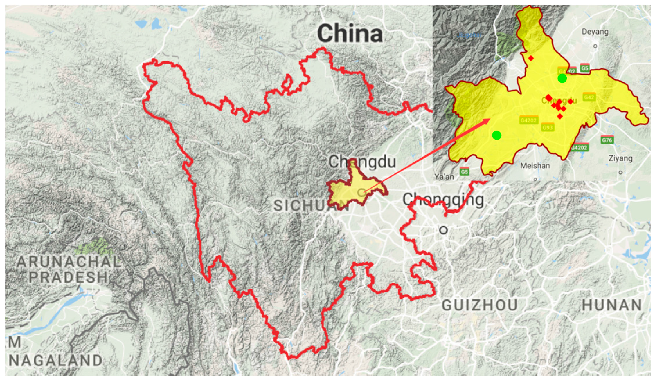 Terrain map of Sichuan Province (the area in yellow is Chengdu, our study area. Red points indicate the air pollution monitoring stations and green points are the meteorological observation stations).