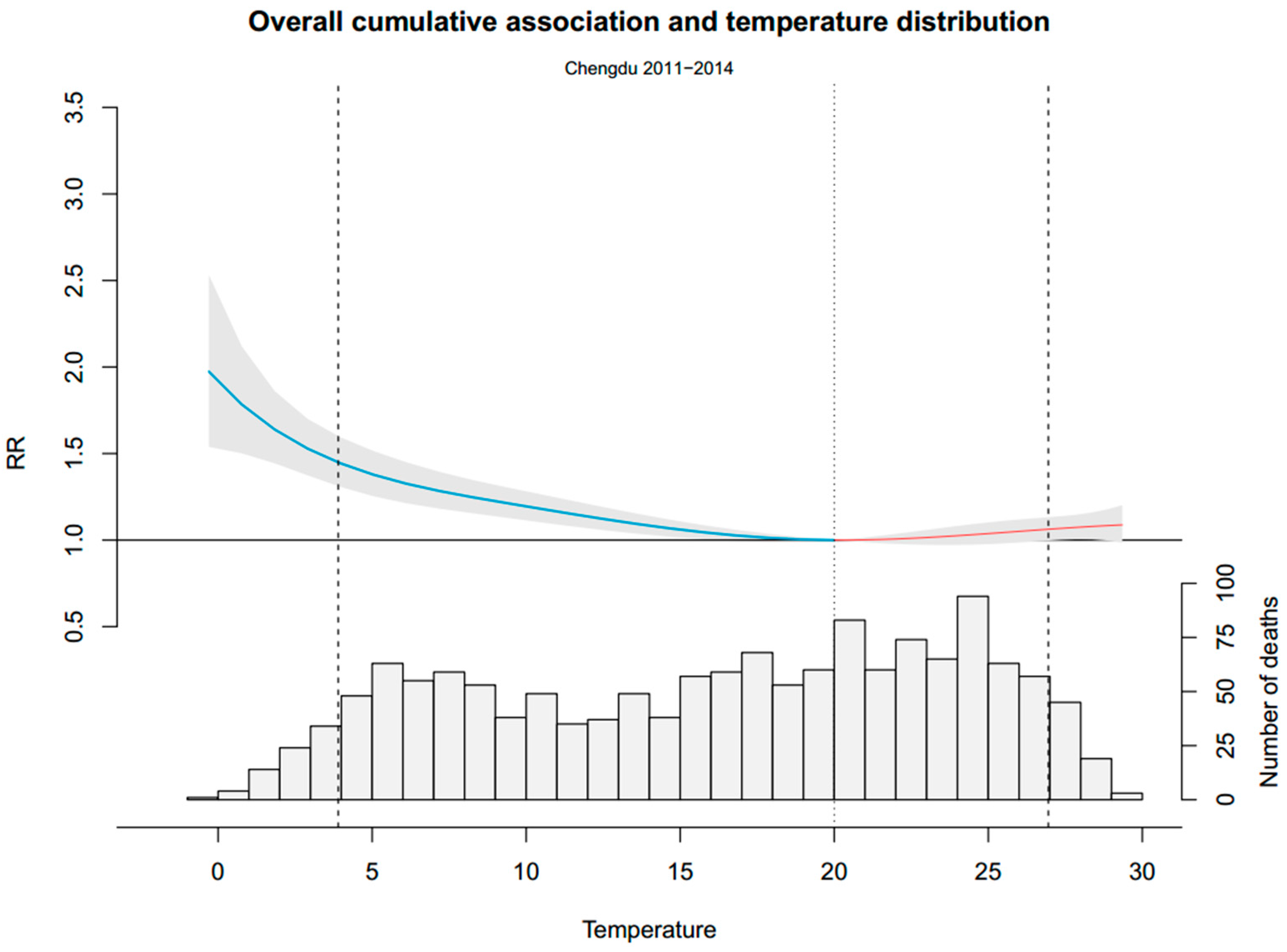 Overall cumulative exposure-response association in Chengdu City. The blue part of the curve is the exposure-response association (with 95% empirical confidence interval, shaded grey) of cold, and the red one presents the heat. The dotted line is minimum mortality temperature and the dashed lines are the 2.5th and 97.5th percentile. RR represents as the relative risk.