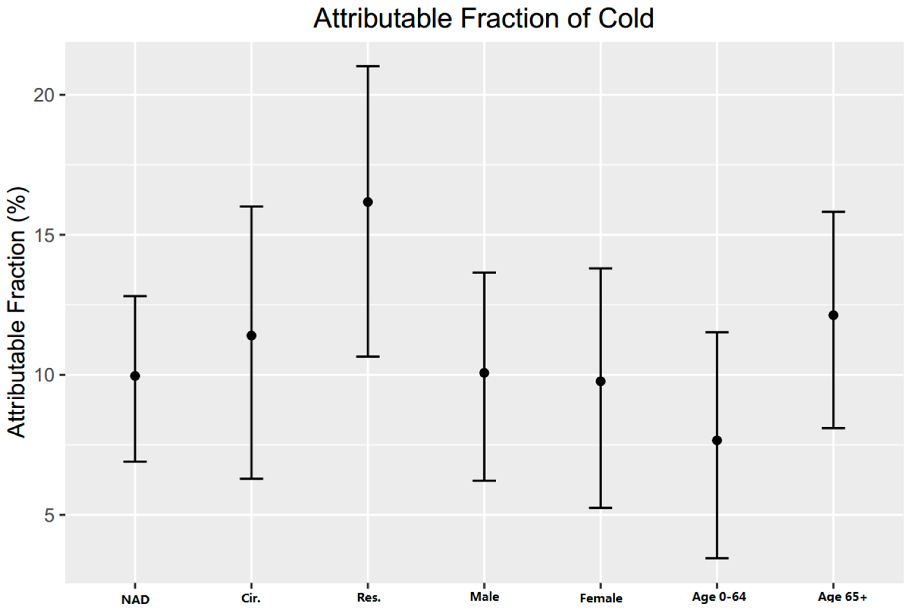 Figure 4 shows the attributable fraction of cold in different groups. Respiratory diseases have a higher AF (19.69%, 95%CI: 14.45%–24.24%) than that of cardiovascular diseases (11.40%, 95%CI: 6.29%–16.01%). People aged above 65 have a higher AF (12.13%, 95%CI: 8.10%–15.82%) than that of people aged 0–64 (7.66%, 95%CI: 3.45%–11.52%). Male and female showed no significant difference (95%CI: −5.35, 5.96).