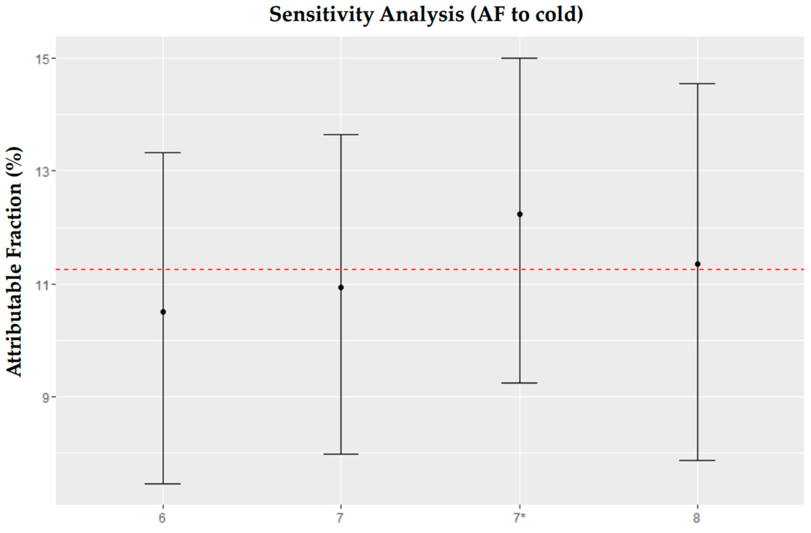 Attributable fraction (AF), which takes into account cold-risk but also the number of days on which that risk is observed, is the most useful indicator of cold-related health burdens. The number of deaths on each day of the series attributable to ambient temperature was computed, using as reference and cut-off the Minimum Mortality Temperature [24], which is the value of temperature at which mortality risk is the lowest. We used a backward perspective, assuming the risk at time t as attributable to a series of exposure events in the past [25].