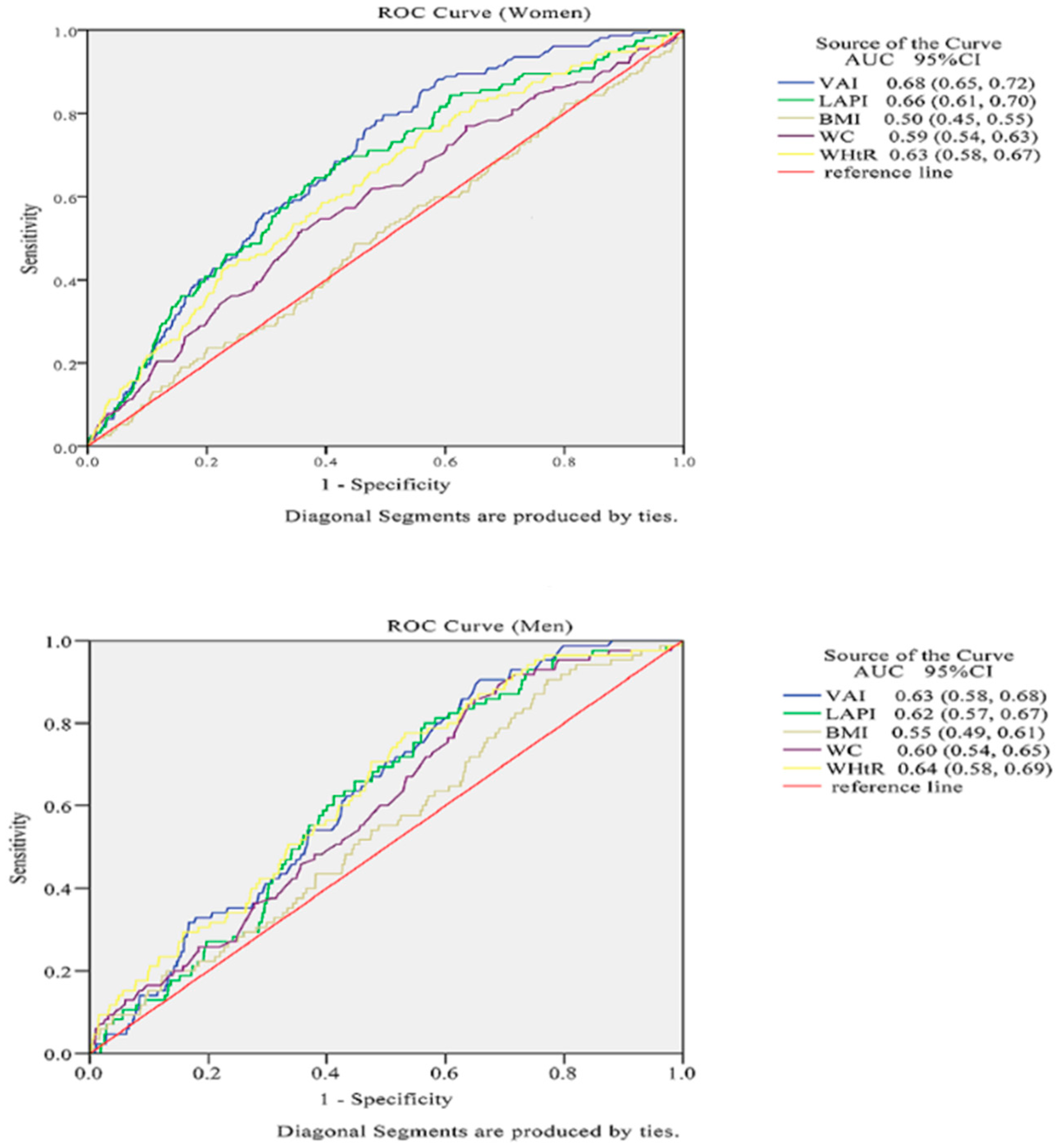 - Du, T.; Yu, X.; Zhang, J.; Sun, X. Lipid accumulation product and visceral adiposity index are effective markers for identifying the metabolically obese normal-weight phenotype. Acta Diabetol. 2015, 52, 855–863. [Google Scholar] [CrossRef] [PubMed]