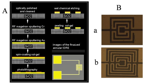 (A) Schematic diagram for the manufacture of the annular microelectrode; (B) Optical micrograph of the annular microelectrode. Black represents the Au microelectrode and yellow represents gaps or spaces. (a) Microelectrode with a 100 µm finger width and a 100 µm finger gap; (b) Microelectrode with a 100 µm finger width and a 50 µm finger gap.