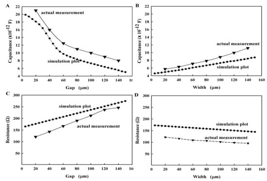 The annular microelectrode (shown in Figure 2A) was chosen as the electrode model. The influence of the electrode size on the equivalent capacitance and equivalent resistance was calculated using the simulation software. We set the electrode band width to 100 µm, and the electrode gap was changed from 5 µm to 150 µm with a step size of 5 µm. The electrode was applied with a 1 V AC voltage, and the frequency was 9 MHz. Results are shown in Figure 4. Results also suggested that the gap between the microelectrode bands had a direct impact on the equivalent capacitance. When the gap size increased from 5 µm to 55 µm, the equivalent capacitance decreased sharply. When the gap size was increased to 150 µm, the equivalent capacitance continued decreasing. However, the drop was reduced, as shown in Figure 4A. The equivalent resistance exhibited an upward trend as gap size increased, as shown in Figure 4C. Similarly, the influence of the electrode band width on the equivalent parameters is shown in Figure 4B,D. The increase in the annular microelectrode band width resulted in the increased linearity of the equivalent capacitance. However, the linearity of the equivalent resistance decreased, and the change in magnitude was smaller than the influence attributed to the changes in gap size caused by the increasing band width. Simulation results suggested that the influences of the microelectrode gap changes were greater than those of the microelectrode band width changes.