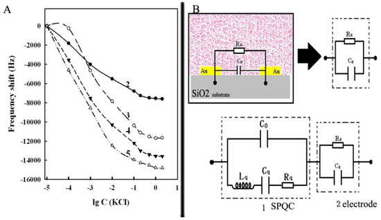Therefore, as is evident from Figure 6A, when the concentration of the electrolyte solution is low, a slight increase in the KCl concentration can greatly increase the equivalent capacitance of the microelectrode. Thus, the piezoelectric frequency shift was significant. Moreover, the capacitance and resistance exhibited a downward trend when the concentration of KCl continuously increased. The piezoelectric frequency shift caused by the capacitance and resistance also decreased. Thus, when the sensor had increased the electrolyte concentration solution, the curve of the piezoelectric shift tended to be smooth. Significantly, the theoretical derivation coincides with the actual measurement results.