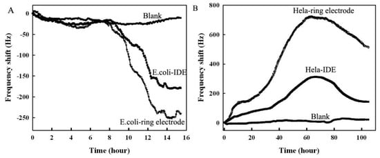 The microelectrode piezoelectric biosensor was employed to monitor the growth of E. coli and HeLa cell in real time. Results are shown in Figure 7. Both the annular microelectrode sensor and the IDME sensor can be used to monitor the growth of E. coli or HeLa cells. However, the maximal frequency shift signal of the annular microelectrode sensor was larger than that of the IDME sensor. This finding suggests that the piezoelectric biosensor series with the annular microelectrode possesses more response sensitivities.
