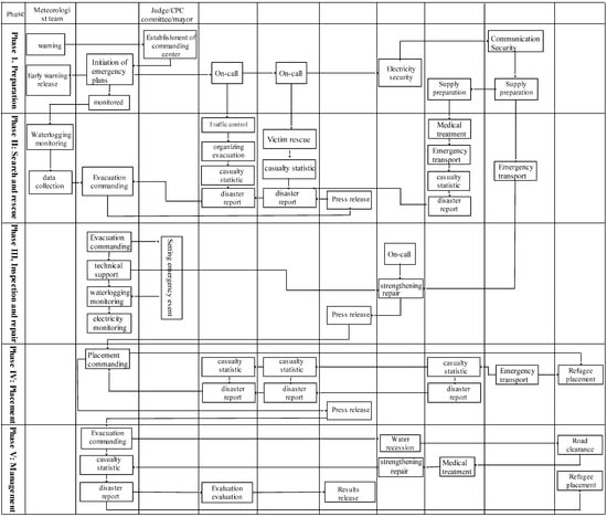 First, the responsibilities were defined for various emergency departments during the wargame of an urban waterlogging disaster emergency. Second, phases were set based on real conditions. Specifically, there was a starting phase, ending phase, sustaining phase and expectation phase. The starting phase was when all the emergency departments started to initiate the emergency process. The ending phase was when all the emergency departments were executing an emergency ending procedure. The expectation phase was the expected number of emergency procedures performed. The sustaining phase was the actual number of emergency procedures performed by each emergency department. In order to ensure the reasonableness of the study and evaluation, these phases were set in accordance with field investigation results and “The Harbin flood emergency plan”, “the People’s Republic of China Flood Control Ordinance” and “Emergency Response Law of the People’s Republic of China”, which is shown in Table 1.