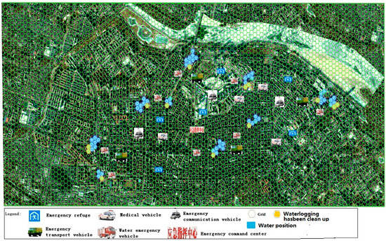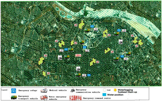 Wargame rules govern the movement of each piece, the outcome of the battle and the wargame. The rules must be set according to the actual property of pieces and battlefield. Military wargame rules need to be set according to realistic military force, weapon systems, equipment systems, mobility and defense force [31]. This study focused on the “game” between various emergency response units and waterlogging incidences. The rules were extracted from the long time disaster management experiences and daily exercises of local emergency departments. The rules defined the guidelines in mobilizing emergency services, relief supplies transport, traffic control, resident evacuation and confrontation ruling, including ruling methods for disaster losses in terms of lives, property, buildings, roads and other infrastructure. Scores were awarded primarily based on the ability of emergency rescue capabilities of the emergency departments and the extent of relief in the road waterlogged regions [32,33]. When residents meet waterlogging conditions, a ruling is made according to the attribute relationship between the resident piece and the waterlogging disaster piece, for example, evacuation of a resident must be deemed as a success or failure based on the water depth.