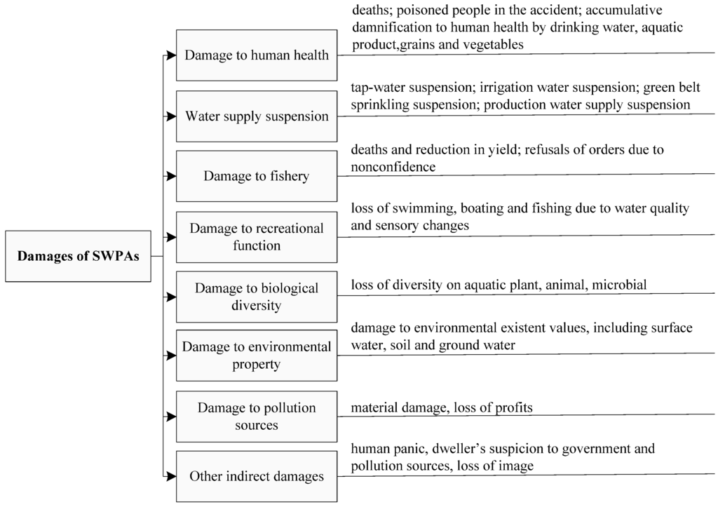 The damages were classified in eight types (Figure 1). The potential damages originated from SWPAs may affect human health, affect the recreational functions of surface water, cause large areas of fish deaths and reduction in aquatic product yields, intermittent water supplies and decrease environmental property values. etc. Furthermore, indirect damages, such as public panic, distrust, suspicion of the government, managers and enterprises may occur after an accident. Detailed explanations of these eight components are provided below.