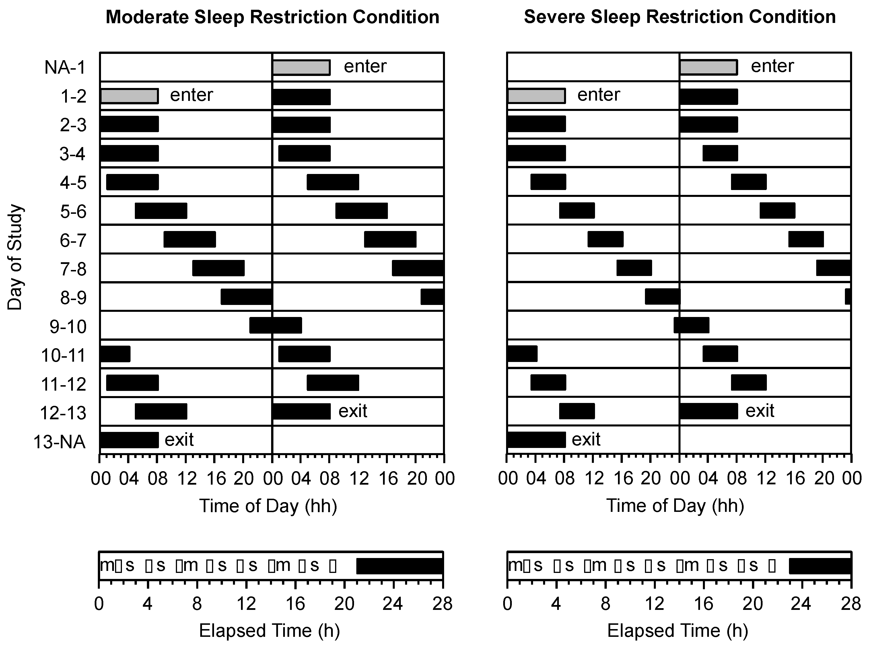 Double raster plot of the study protocol in the moderate sleep restriction condition (top left panel) and the severe sleep restriction condition (top right panel). The vertical axis represents calendar day of study. The horizontal axis represents the time of day and is 24 h in length. Grey bars represent time in bed on baseline days. Black bars represent time in bed on forced desynchrony days in the moderate sleep restriction condition (equivalent to 6 h time in bed/24 h) and the severe sleep restriction condition (equivalent to 4 h time in bed/24 h). The timing of (m) meals, (s) snacks and (•) test batteries are illustrated as a function of elapsed time into the wake period in the moderate sleep restriction condition (bottom left panel) and the severe sleep restriction condition (bottom right panel).