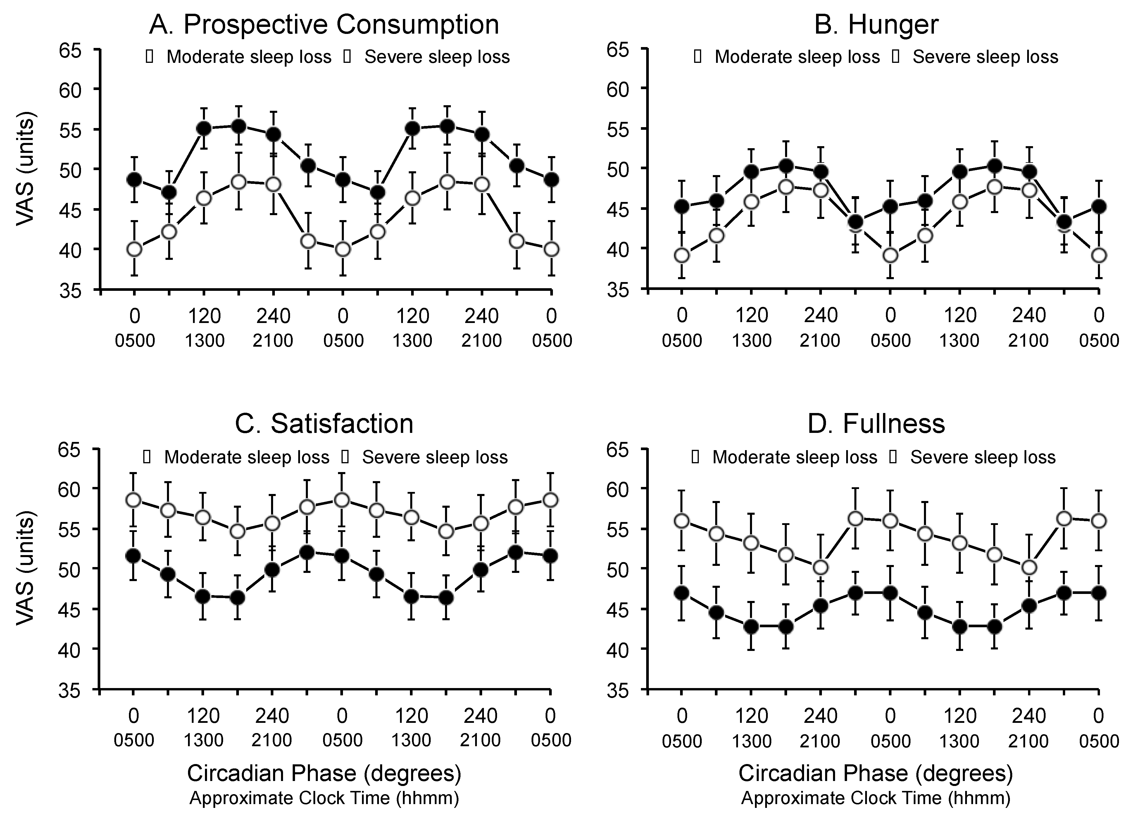 Main effect of circadian phase on (A) prospective consumption; (B) hunger; (C) satisfaction; and (D) fullness during the forced desynchrony segment of the protocol for participants in the moderate sleep restriction condition (open circles) and the severe sleep restriction condition (closed circles). Data are double-plotted relative to the circadian nadir (degrees) and are plotted at the midpoint of the bins. Data are mean ± SEM.