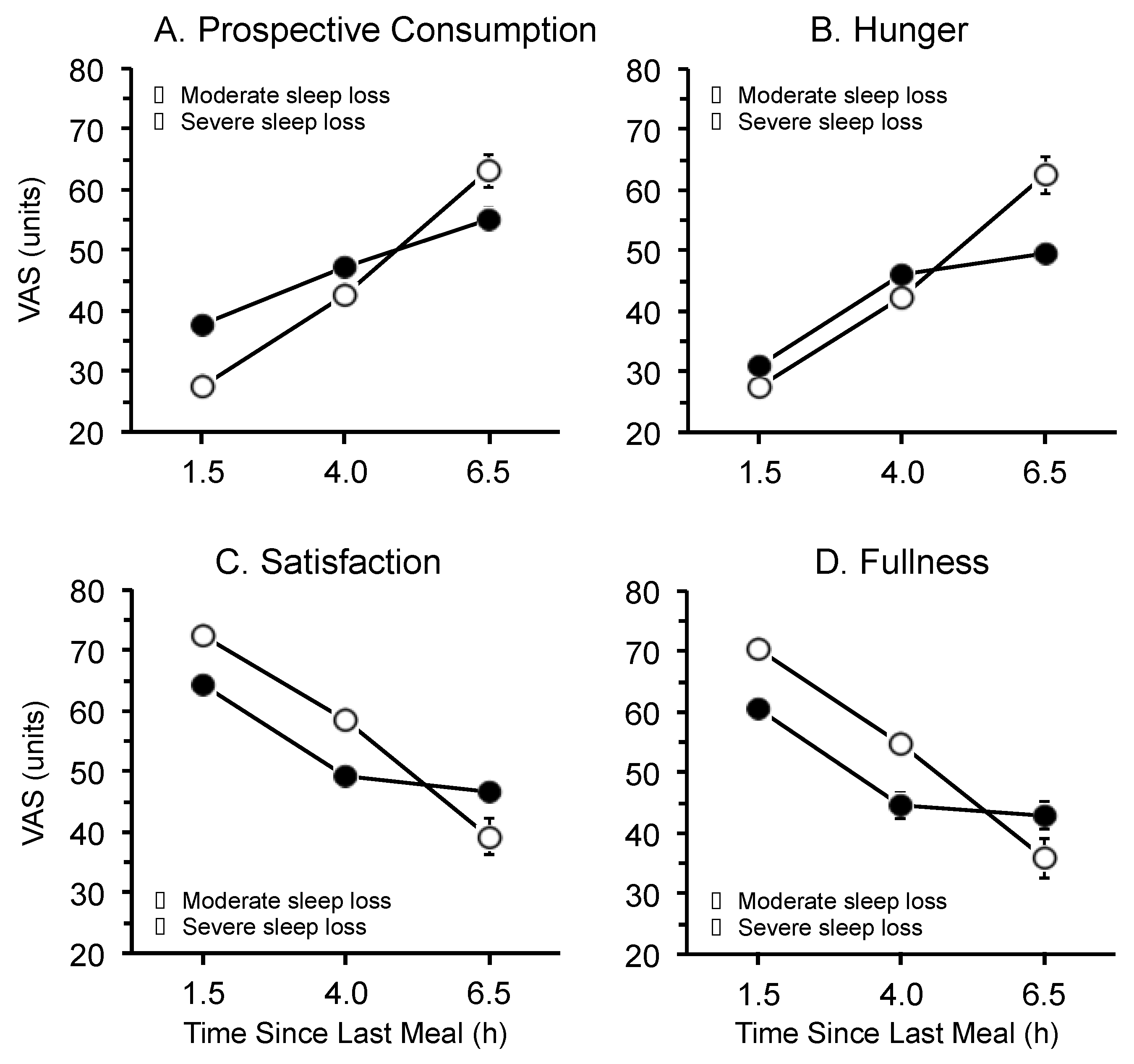 Main effect of time since last meal on (A) prospective consumption; (B) hunger; (C) satisfaction; and (D) fullness during the forced desynchrony segment of the protocol for participants in the moderate sleep restriction condition (open circles) and the severe sleep restriction condition (closed circles). Data are mean ± SEM (N.B. in some cases error bars are obscured by the symbols).