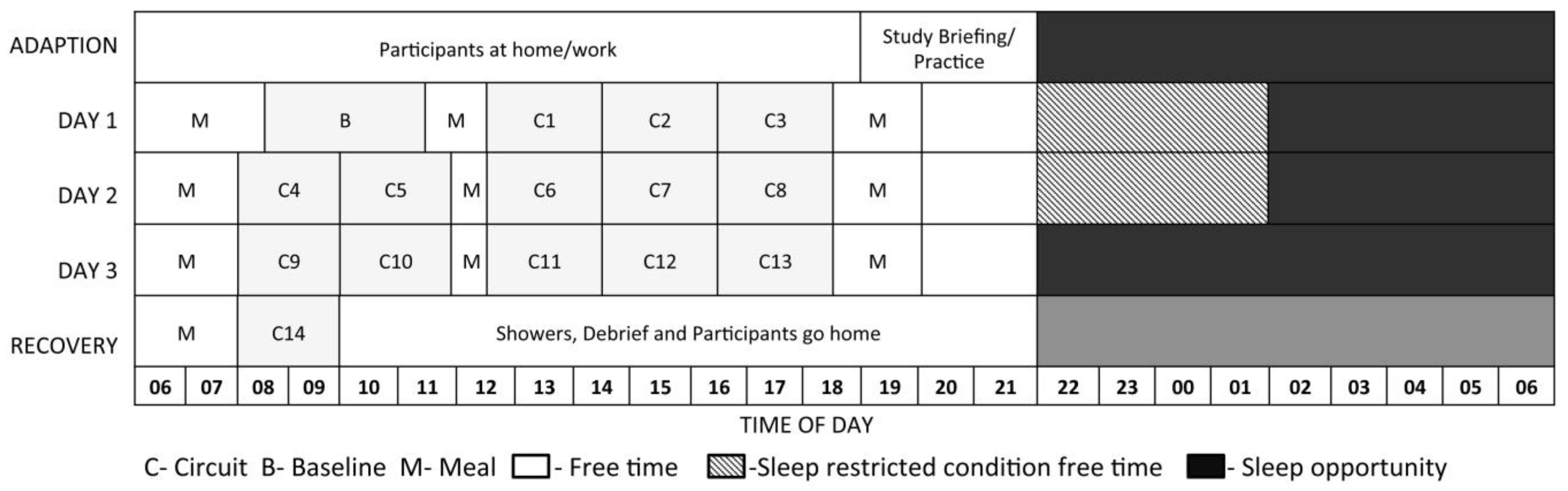 The study protocol outlining each testing circuit, scheduled meal times, free time, and sleep opportunity. Participants in the sleep restricted conditions were given an extended free time.