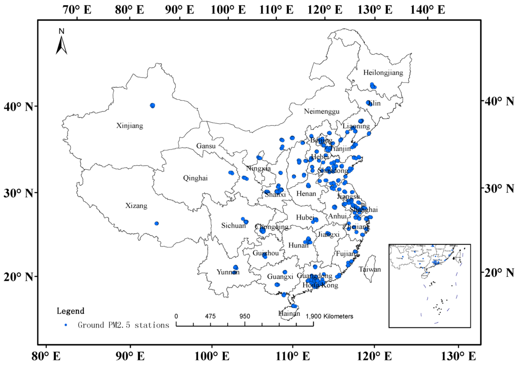 Numerous epidemiological studies have been conducted to determine the relationship between human health and fine particulate matter (PM2.5, particles with an aerodynamic diameter ≤ 2.5 μm), and have indicated that they are highly correlated; therefore, accurate and long-term PM2.5 data are very important for epidemiological studies [1,2,3,4]. Ground-level PM2.5 monitoring sites can provide accurate and real-time data. However, their spatial coverage is so limited that they are insufficient to capture the spatial variability of the PM2.5 concentrations for epidemiological studies [5,6].