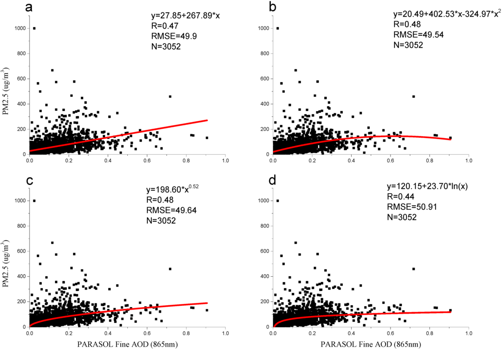 Figure 2. The four regression models based on PM2.5 concentrations and PARASOL AOD data (p < 0.05) (a) the linear regression model; (b) the quadratic regression model; (c) the power regression model; and (d) the logarithmic regression model.
