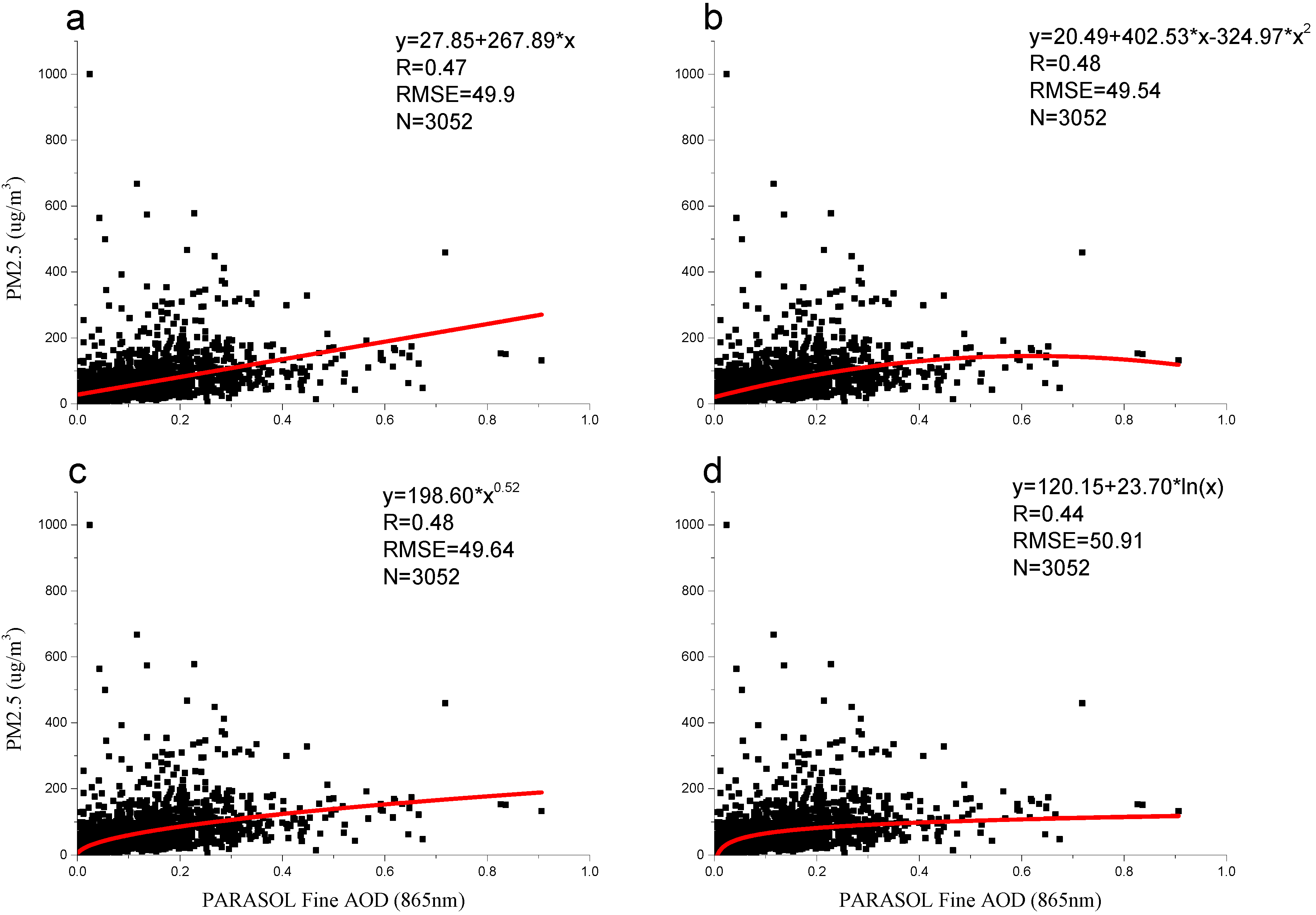 The four regression models based on PM2.5 concentrations and PARASOL AOD data (p < 0.05) (a) the linear regression model; (b) the quadratic regression model; (c) the power regression model; and (d) the logarithmic regression model.