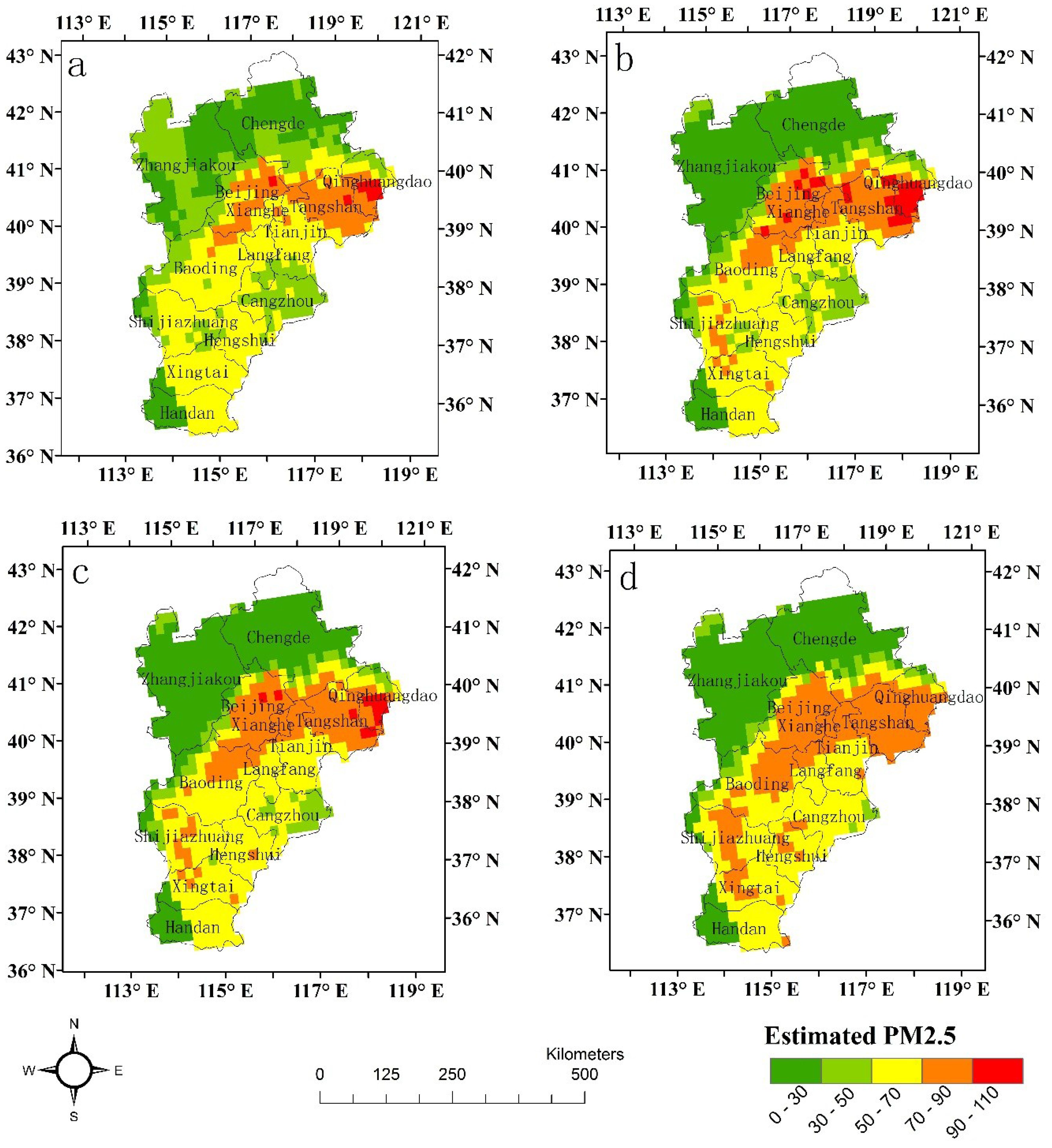 It was noticed that the PM2.5 distribution maps based on the four models show some consistency. The results showed that Beijing, Tangshan and Qinhuangdao had the highest PM2.5 concentrations (>70.0 μg/m3), while Zhangjiakou and Chengde had the lowest PM2.5 concentrations (≤30.0 μg/m3). In addition, all four models underestimated the ground-level PM2.5 concentrations for heavy pollution events, for which the maximum satellite-estimated PM2.5 concentrations were 96.4 μg/m3, 102.2 μg/m3, 97.8 μg/m3, and 87.9 μg/m3 in Figure 3a–d, respectively, while the maximum ground-level observed value was 151.0 μg/m3 (Beijing). Similar results have been reported in previous studies when MODIS AOD data were used to estimate ground-level PM2.5 concentrations for heavy pollution events [45,46]. It may because PARASOL and MODIS observations cannot distinguish the aerosol vertical profile and often are unable to detect pollution build up in stagnant inversion layers.