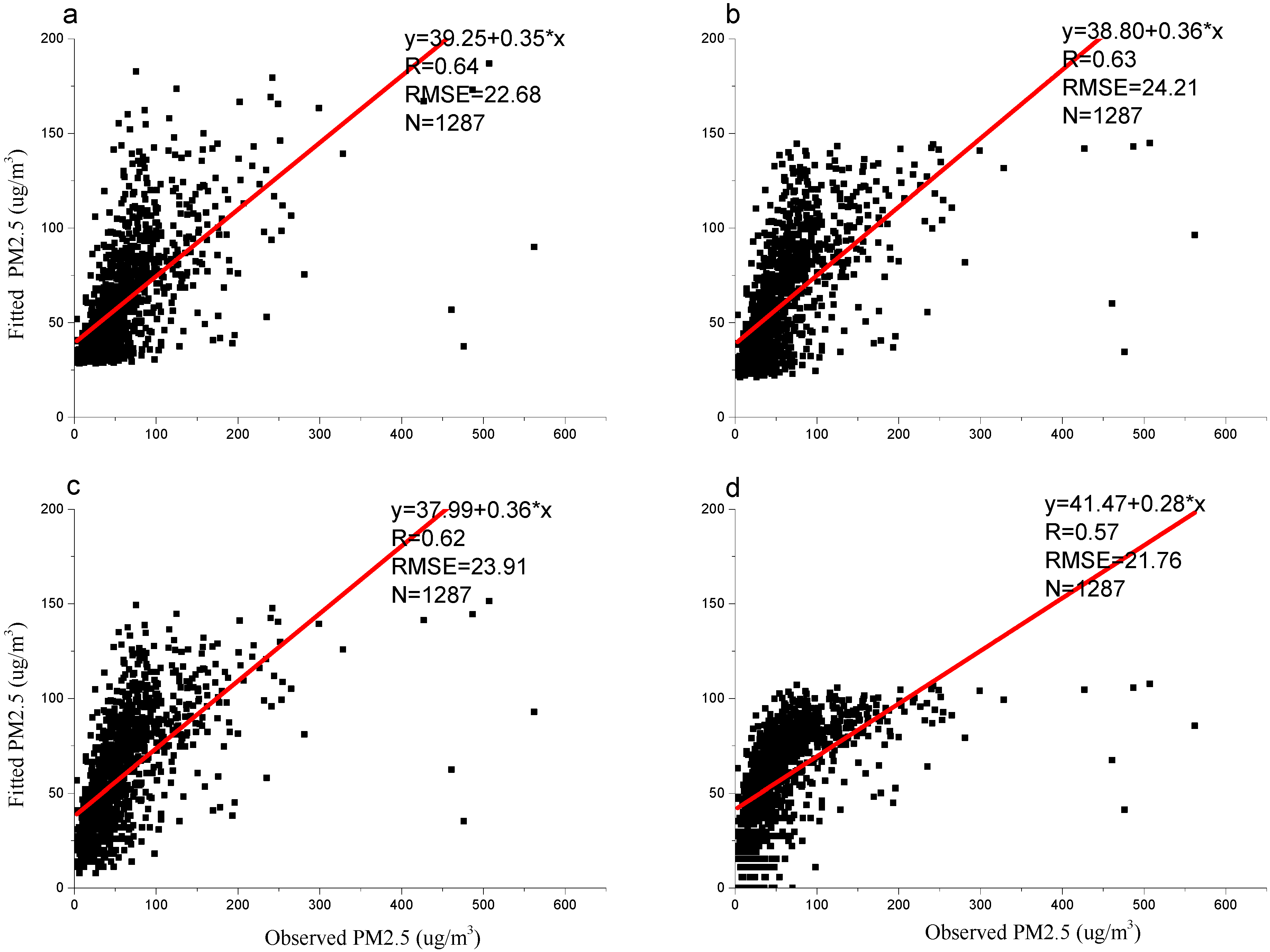 A cross-validation approach was used to evaluate the ability of the four models to predict PM2.5 concentrations (Figure 4). A comparison between the satellite-predicted and ground-level observed values for the linear regression model, the quadratic regression model, the power regression model, and the logarithmic regression model revealed R values of 0.64, 0.63, 0.62 and 0.57, and RMSE values of 22.68 μg/m3, 24.21 μg/m3, 23.91 μg/m3, and 21.76 μg/m3, respectively. In addition, the slopes of the regression (i.e., 0.35, 0.36, 0.36, and 0.28) suggested that all models underestimated the PM2.5 concentrations compared with the ground-level PM2.5 concentrations. These results show that the four models were good for predicting lower PM2.5 levels using only PARASOL level 2 AOD, which is important, especially in rural and remote areas. However, they cannot currently be used to accurately predict higher PM2.5 levels, which may change if additional information is incorporated into the models.
