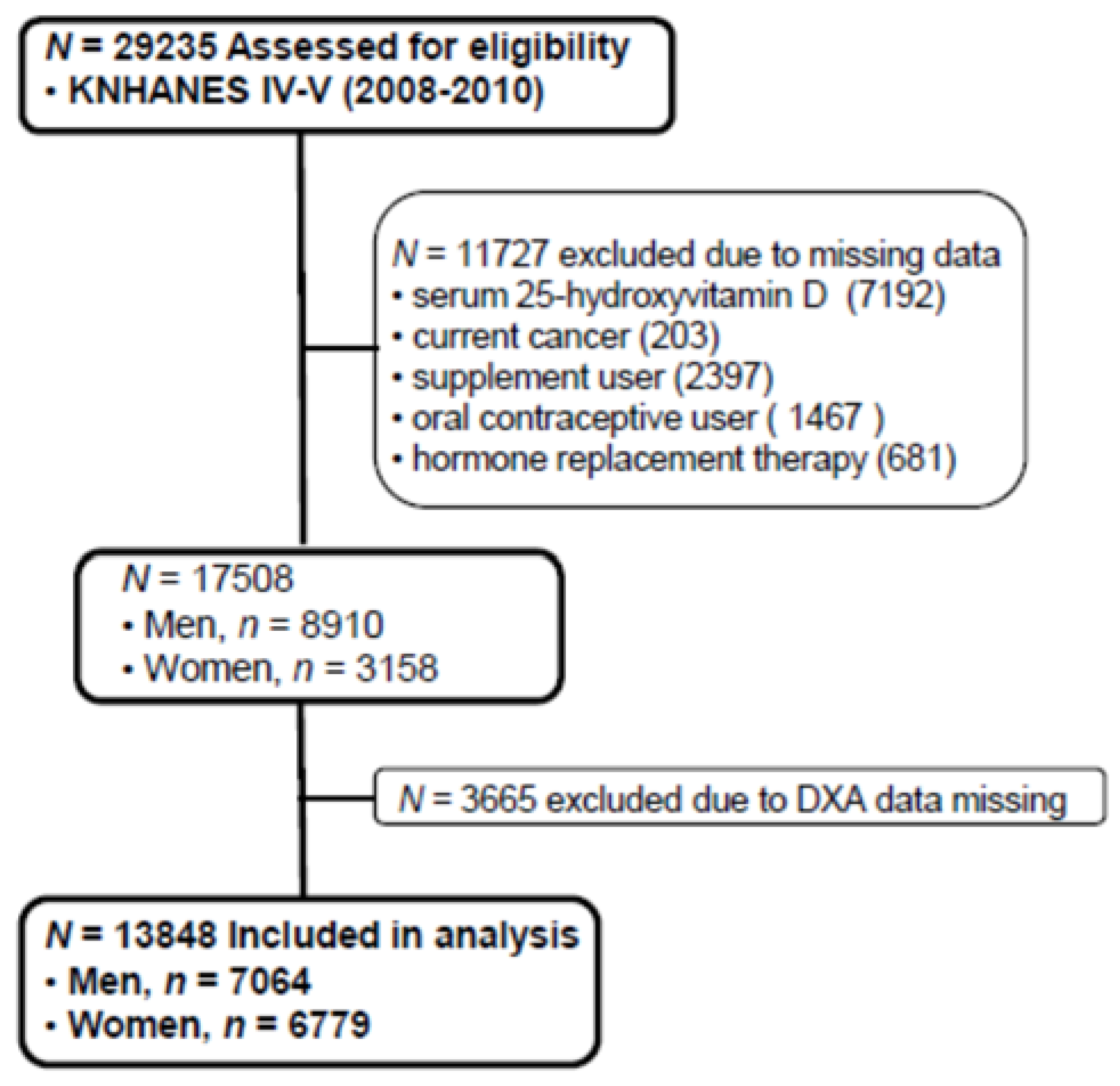 The Korean National Health and Nutrition Examination Survey (KNHANES), conducted periodically by the Korea Centers for Disease Control and Prevention since 1998, provides comprehensive information on health status, health behavior, nutritional status, and socio-demographics in national districts in Korea. The fourth (IV-2 and IV-3, 2008, 2009) and fifth (V-1, 2010) KNHANES data containing serum 25(OH)D concentration and Dual X-ray Energy Absorptiometry (DXA) were used in this cross-sectional analysis. From an initial total of 29,235 males and females, 11,727 subjects (missing data of serum 25(OH)D, current cancers, any supplement user, oral contraceptive users, hormone replacement therapy) were excluded. Of 17,508 evaluated subjects, 3665 subjects were also excluded for missing data of DXA. A final 13,843 participants (7064 males and 6779 females) were used in this analysis as shown in Figure 1. All participants provided written informed consent before taking the survey.