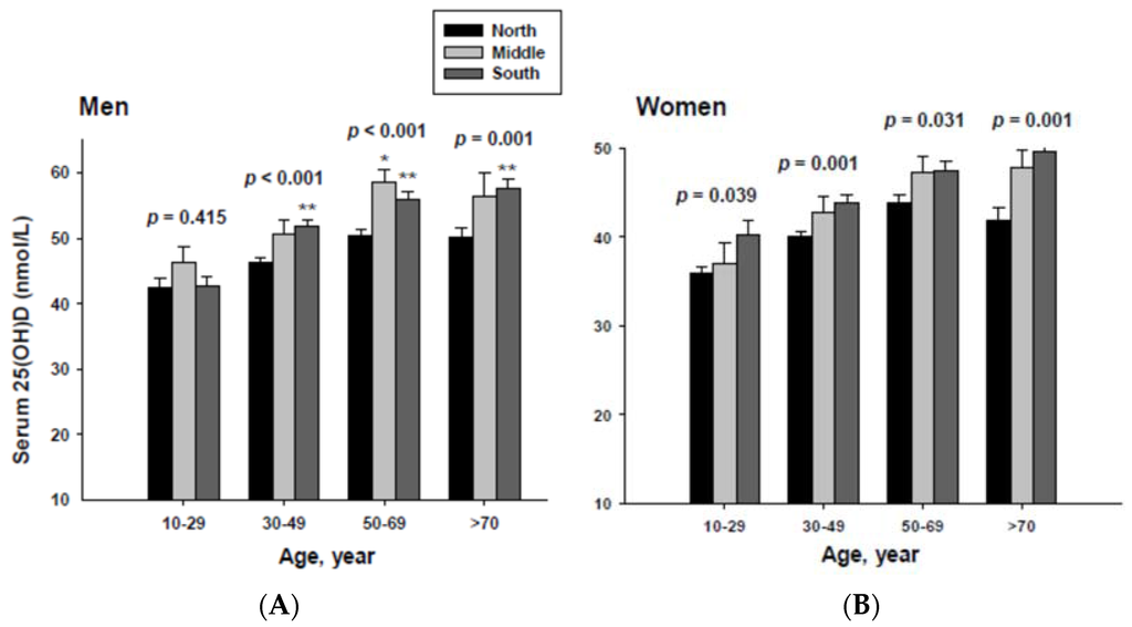 Adjusted mean serum 25(OH)D concentrations according to age and geographic location in men (A) and women (B). The p values are p for trend in the same group from ANCOVA test adjusted for total body fat, smoking, job, alcohol intake, moderate activity and education for men, and for total body fat, smoking, job, alcohol intake, moderate activity, education, menopause, oral contraceptive use and hormone replacement therapy for women Subject numbers for men are 10–29 years old, 832, 151, 591; 30–49 years old, 1296, 267, 985; 50–69 years old, 976, 286, 902; ≥70 years old, 325, 120, 333 for North, Middle and South, respectively, and for women are 10–29 years old, 806, 192, 556; 30–49 years old, 1358, 255, 1017; 50–69 years old, 714, 248, 785; ≥70 years old, 304, 131, 413 for North, Middle and South, respectively. * p < 0.05, North vs. Middle; ** p < 0.05 North vs. South.