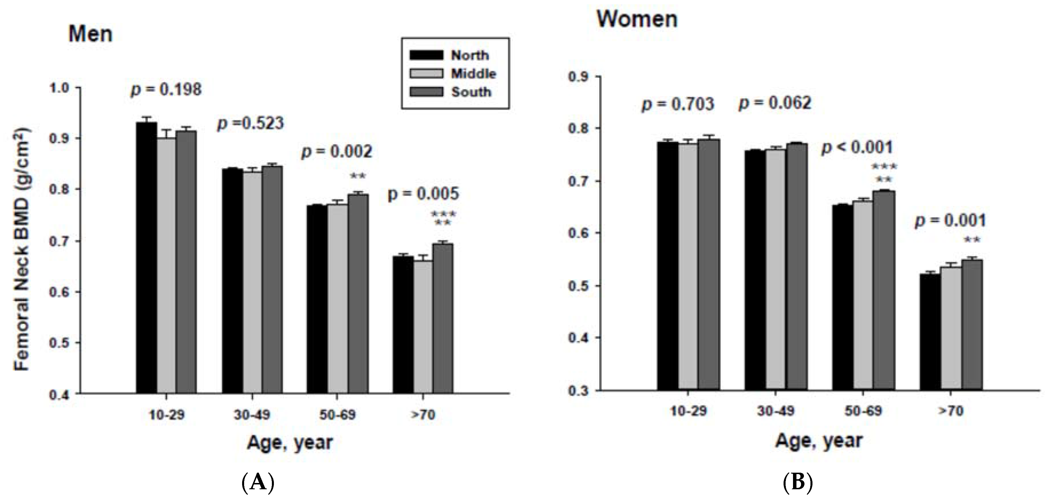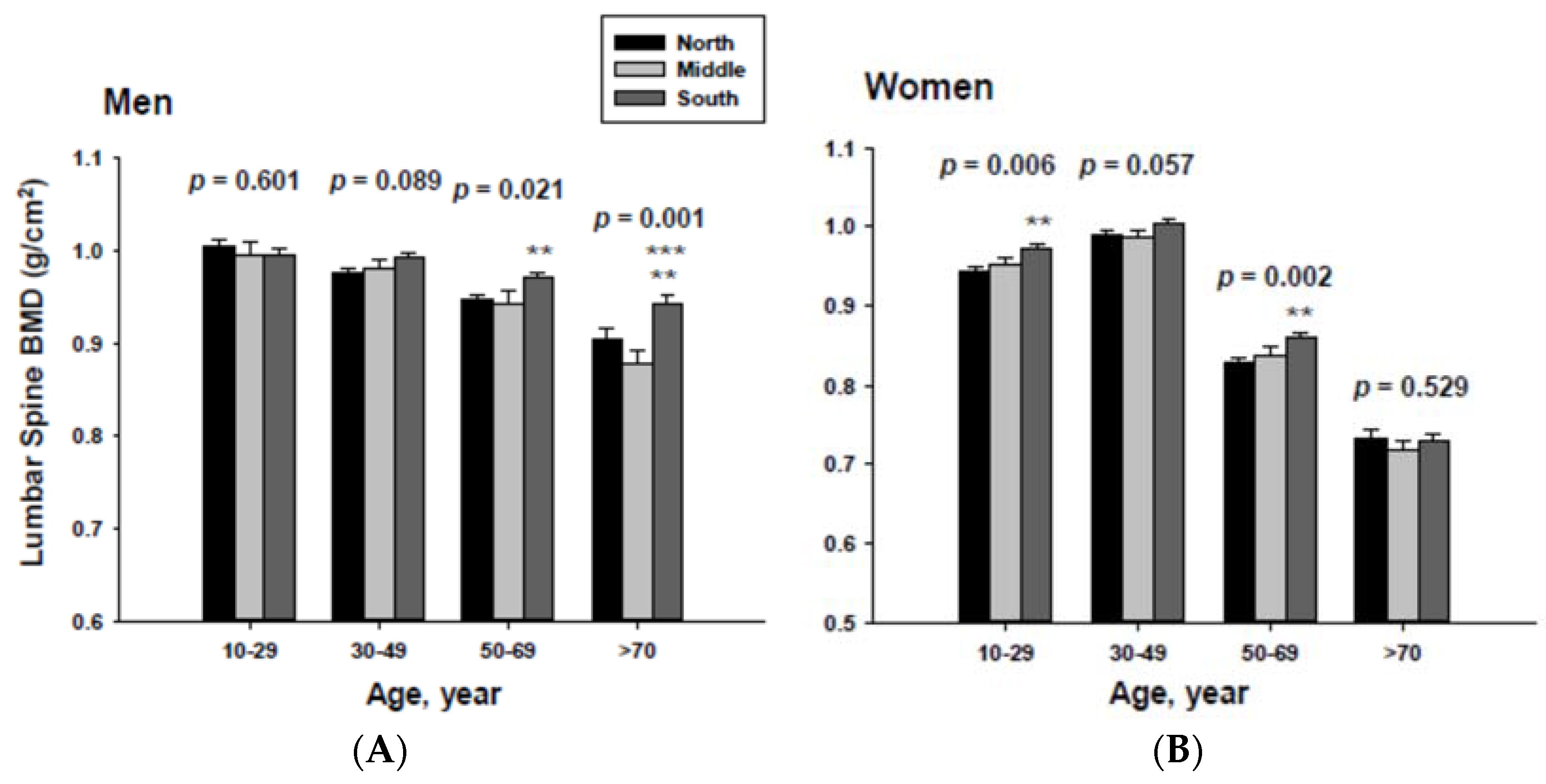 In addition, men living in the South had significantly higher femoral neck BMD than those men living in the Middle at the ≥70-year-old age. Women living in the south also had significantly higher femoral neck BMD than those women living in the Middle at the 60 to 69-yeal-old age group. As presented in Figure 4, those men living in the South had significantly higher lumbar spine BMD than those living in the North at the 50 to 69 and ≥70-year-old age men groups as well as those living in the Middle at the ≥70-year-old age men group. Those women living in the South also had significantly higher lumbar spine BMD than those living in the North at the 10 to 29 and 50 to 69-year-old age women groups.