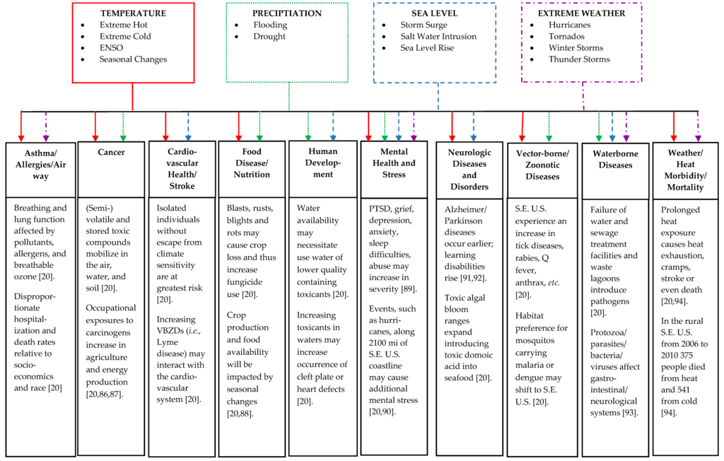 | Water and Soil | Toxicant Exposure: Reduction in fossil fuel use minimizes the release of some neurotoxicants including arsenic, mercury, and other heavy metals [20]. Proper disposal of products such as florescent light bulbs and batteries for electric vehicles is essential to reduce risk of contamination [20]. Proper agricultural practices such as minimal to no-tillage of land and proper pesticide application reduce erosion and minimize pesticide infiltration into waters and soils [104,107]. By removing toxic compounds from building materials and facilitating recycling and biodegradation of components, human illness through air and waterborne pollution is reduced [104]. Diverting staple crops for use as biofuels may necessitate the use of additional chemicals for crop production [20]. Disease Transmission: Reforestation can help with flooding and air quality but be a breeding ground for VBZD and reduce potential agricultural land [20]. Continued development of solar and wind farms minimizes water usage in power production and, in turn, minimizes threats of waterborne disease [20]. | Communication Methods: It is important to continue developing early warning systems, evacuation plans, and emergency plans and warning systems [108,109]. Planners will need to continue efforts to fortify natural barriers for flooding and erosion, such as wetlands and tidal marches [20]. Combatting Drought: Ponds and dams are used widely to manage water supplies, possibly allowing for the spread of certain VBZD [110]. Capture and storage of rainwater may prove excellent breeding grounds for mosquitos harboring VBZD. In addition, pesticide use to control organisms harboring VBZD may introduce potential toxicants into environmental sectors [20]. Land Use: Zoning permits are limited for at-risk land [108,109]. Best land-use practices in agriculture and use of locally recycled water (grey-water) slow rates of water table depletion and reduce the impacts of heavy precipitation events that are anticipated in the Southeast [20]. | Asthma, Respiratory Allergies, and Airway Diseases. Mental Health and Stress-Related Disorders. Neurological Diseases and Disorders. Vectorborne/Zoonotic Diseases (VBZD). Waterborne Diseases. Weather and Heat-Related Morbidity and Mortality. |