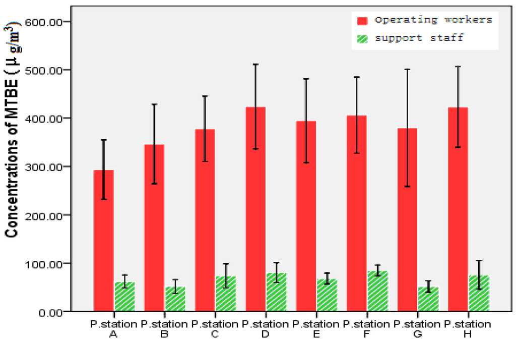 As shown in Figure 1, the concentrations of MTBE for personal inhalation were analyzed by HSSPME GC-MS. The mean MTBE exposure concentrations of the operating workers at petrol stations A through H were 293.46, 346.53, 377.89, 423.85, 394.67, 406.2 2, 379.89 and 423.03 μg/m3, respectively; while those of the support staff were 62.12, 51.65, 73.85, 80.70, 68.19, 85.00, 51.58 and 75.84 μg/m3, respectively, at the individual petrol stations. All of the observed values in each group were below the occupational TLV of 50 ppm (180,500 µg/m3). As shown in Figure 2, the mean values of MTBE exposure in the operating workers and support staff at all of the observed petrol stations were 388.38 μg/m3 and 71.61 μg/m3, respectively, and there is a statistically significant difference between them (t = 164.70, p < 0.01).