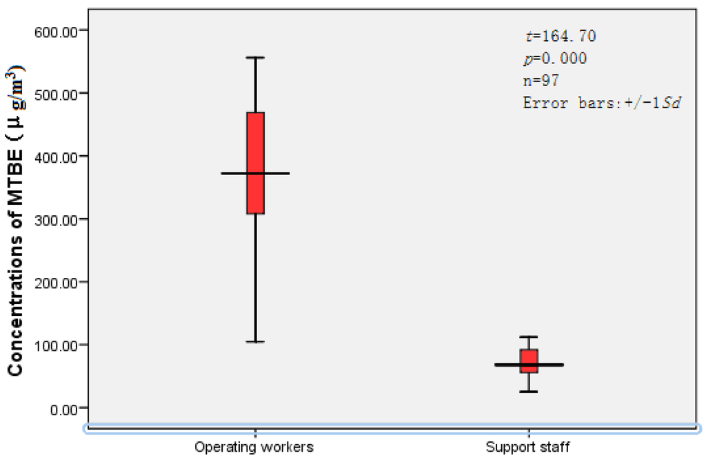 SPSS 16.0 for Windows (SPSS Inc., an IBM Company, Chicago, IL, USA) was used for the statistical analysis of the obtained data. The independent-sample t test was used to compare the concentrations of inhalational MTBE between groups of operating workers and support staff. The data are expressed as mean ± S.D. and the standard for a statistical significance was p < 0.05.