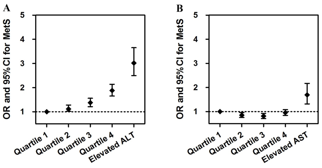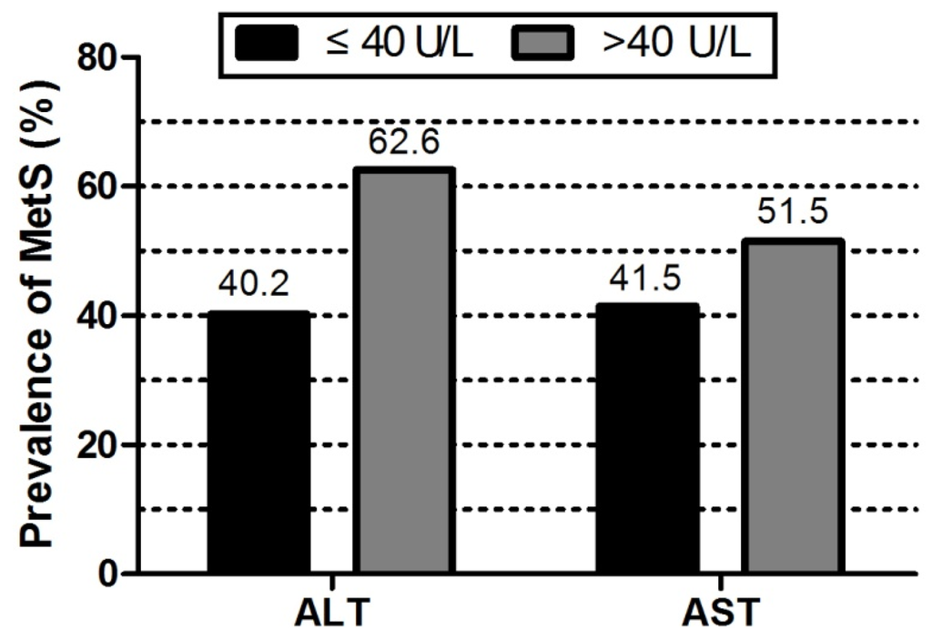 In summary, these representative data of the Chinese general population suggested that elevated levels of ALT and AST, were independently associated with an increased prevalence of MetS. Moreover, elevated ALT level was more closely associated with MetS than elevated AST levels. In addition to that, only ALT level within reference range had significant relationship with the MetS while AST within normal range was not associated with MetS. However, further epidemiologic investigations using longitudinal designs are necessary to understand associations between serum ALT or AST levels and MetS.