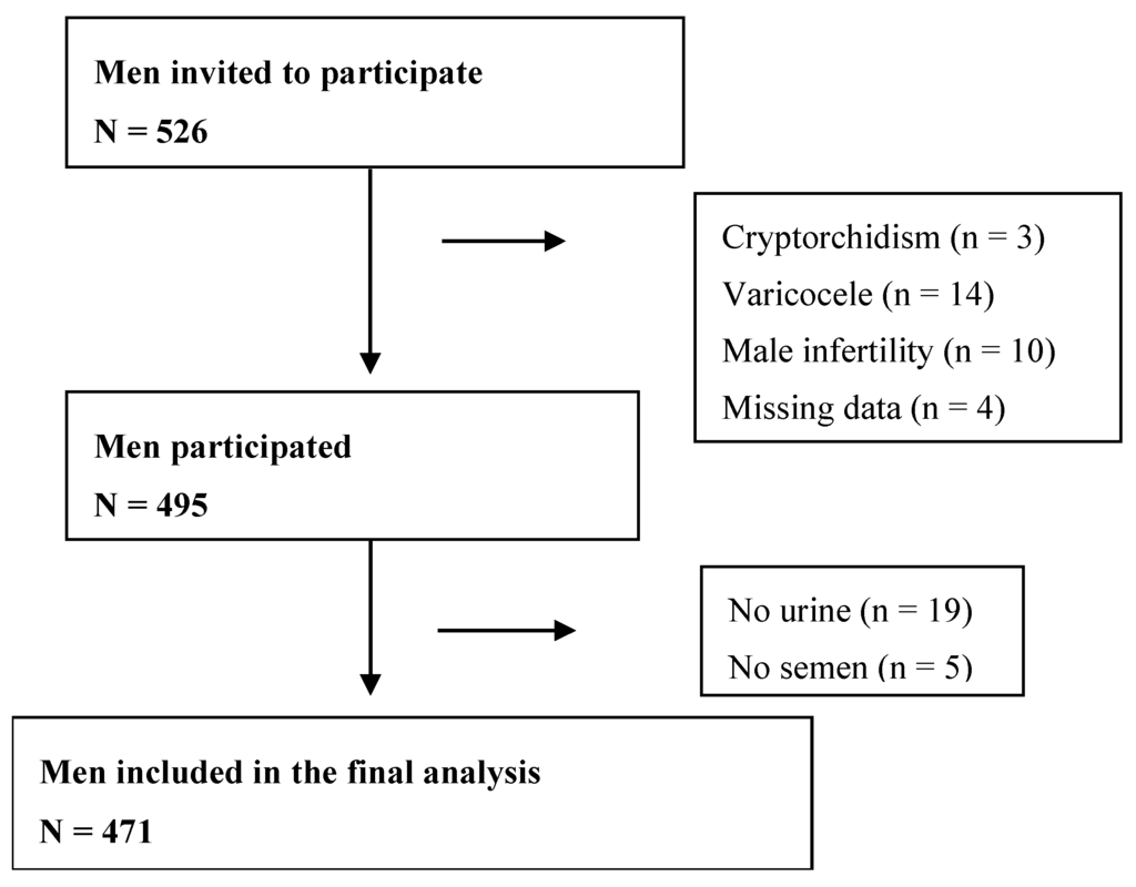 Of the 526 men recruited, we excluded subjects with cryptorchidism, varicocele, male infertility and those who failed to provide urine or semen samples. Four-hundred-seventy-one men were included in the final analysis (Figure 1).