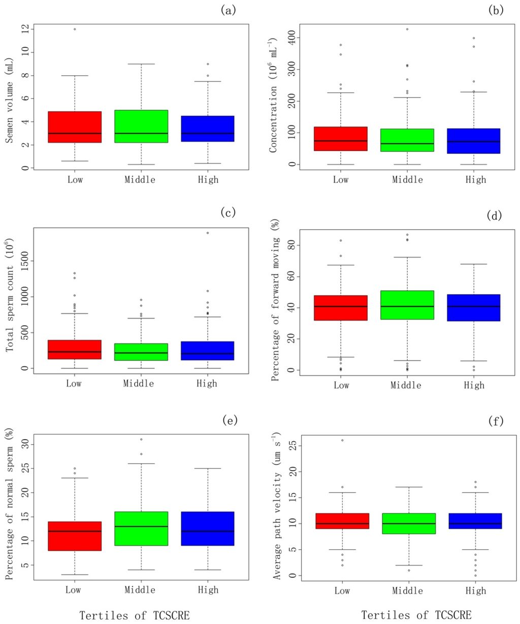 Figure 2. Comparison of semen quality parameters between tertiles of urinary TCS concentration among Chinese men (471) recruited during November 2013–March 2014. The x-axis refers to tertiles of urinary TCS level corrected by creatinine concentration (TCSCRE): low tertile (<0.66 ng·mg−1), middle tertile (0.66–2.33 ng·mg−1) and high tertile (≥2.33 ng·mg−1); The y-axis refers to sperm quality parameters, including semen volume (a); sperm concentration (b); total sperm count (c); percentage of forward moving (d); percentage of normal sperm (e) and average path velocity (f). The five lines extending vertically along Y-axis from top to bottom are respectively defined to be: Q3 (75%) + 1.5 × inter quartile range (IQR), Q3, median, Q2 (25%), Q2− 1.5 × IQR.