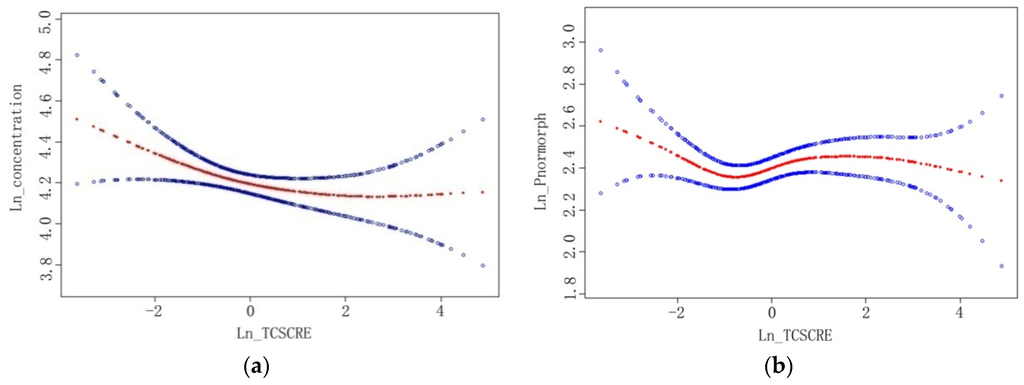 Figure 3. The relationships between triclosan (TCS) and sperm concentration and percent of normal morphology sperm among Chinese men (471) recruited during November 2013–March 2014. The x-axis refers to natural logarithm-transformed urinary TCS level corrected by creatinine concentration (Ln_TCSCRE); They-axis refers to natural logarithm-transformed sperm concentration (Ln_concentration) (a) and percent of normal morphology sperm (Ln_Pnormorph) (b). The red line is fitted by generalized additive model showing the relationship between x and y axes. The two blue lines refer to 95% confidence intervals. All models were adjusted for age, BMI, abstinence period, education, income, current smoking, drinking and exposure to other chemicals or heavy metals.