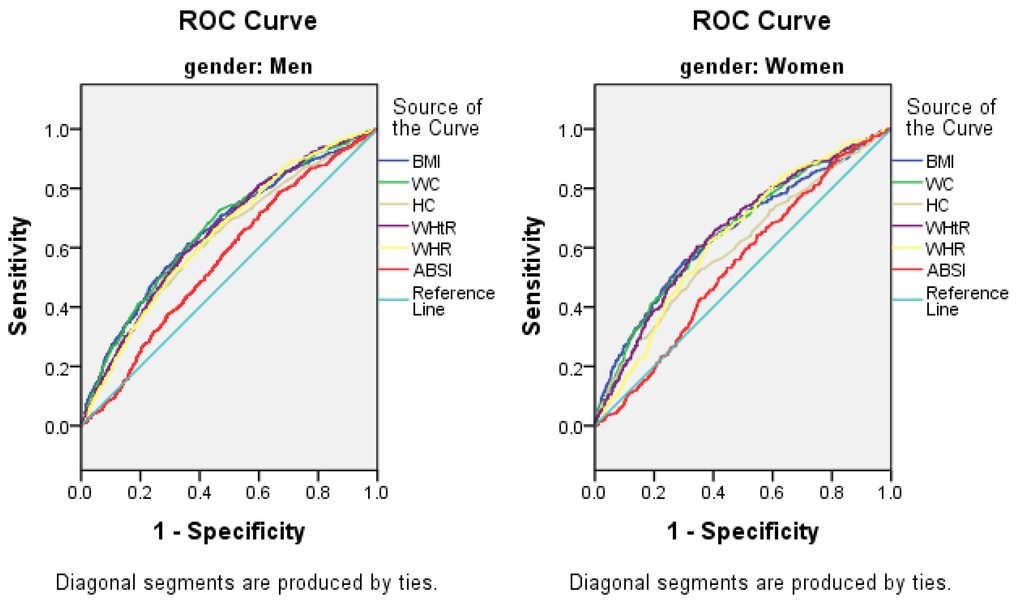 The adjusted ORs for elevated ALT according to the quartiles of anthropometric indices are shown in Table 4. In general, the ORs of elevated ALT increased with increasing quartiles for all of the anthropometric measurements, after adjusting for age, race, smoking, drinking, education, physical activity, family income, history of medications, blood pressure, fasting plasma glucose, TC, TG, HDL, LDL, and uric acid. With the use of the ORs in the first quartile as a reference, considering the ORs of elevated ALT for the highest quartile of each anthropometric measurement, the WHtR was the best predictor of elevated ALT in both sexes (OR: 4.38, 95% CI: 3.15–6.08 in men; OR: 4.29, 95% CI: 2.91–6.33 in women, both p < 0.001). Although ABSI was the poorest predictor of elevated ALT in men (OR: 2.51, 95% CI: 1.93–3.21, p < 0.001), it showed no statistical significance for predicting elevated ALT in women. Compared to the ABSI, HC, WHR, and WC, the BMI was a better predictor for elevated ALT in both sexes (OR: 4.17, 95% CI: 3.15–5.54 in men; OR: 4.15, 95% CI: 2.78–6.19 in women, both p < 0.001).