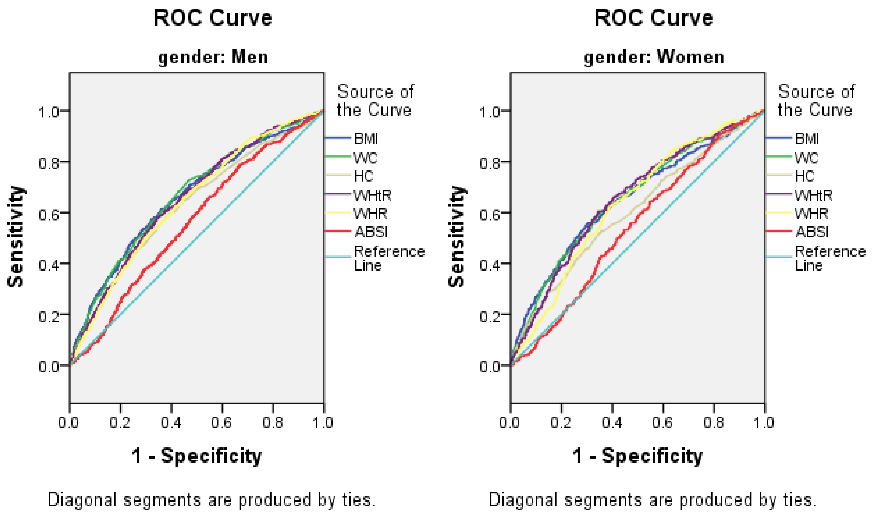 The discriminatory power of BMI, WC, HC, WHtR, WHR and ABSI in the prediction of elevated ALT. Area under the Receiver Operating Characteristic curve of BMI, WC, HC, WHtR, WHR and ABSI to identify subjects with elevated ALT according to sex. Abbreviations: BMI, body mass index; WC, waist circumference; HC, hip circumference; WHtR, waist-to-height ratio; WHR, waist-to-hip ratio; ABSI, a body shape index.