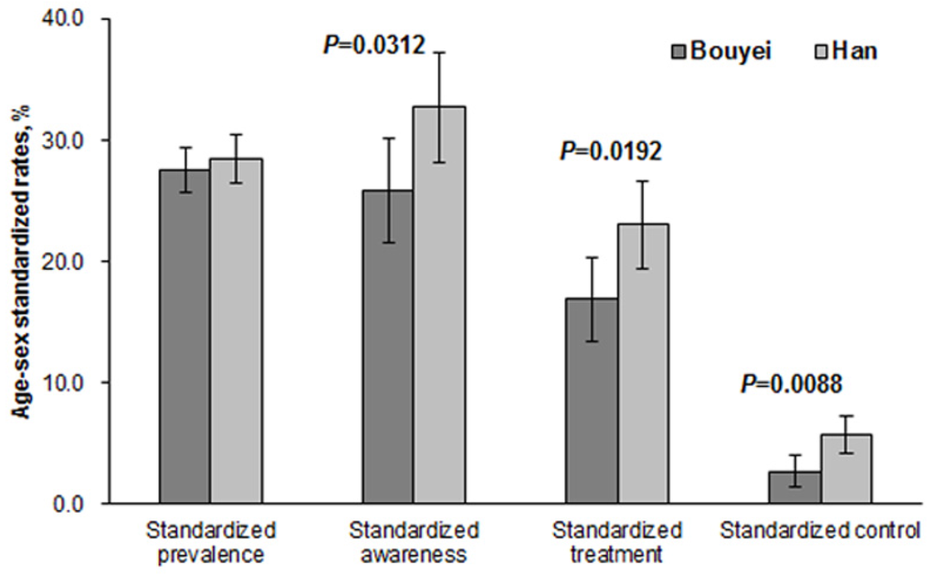 Standardized rates of prevalence, awareness, treatment, and control in Bouyei and Han.