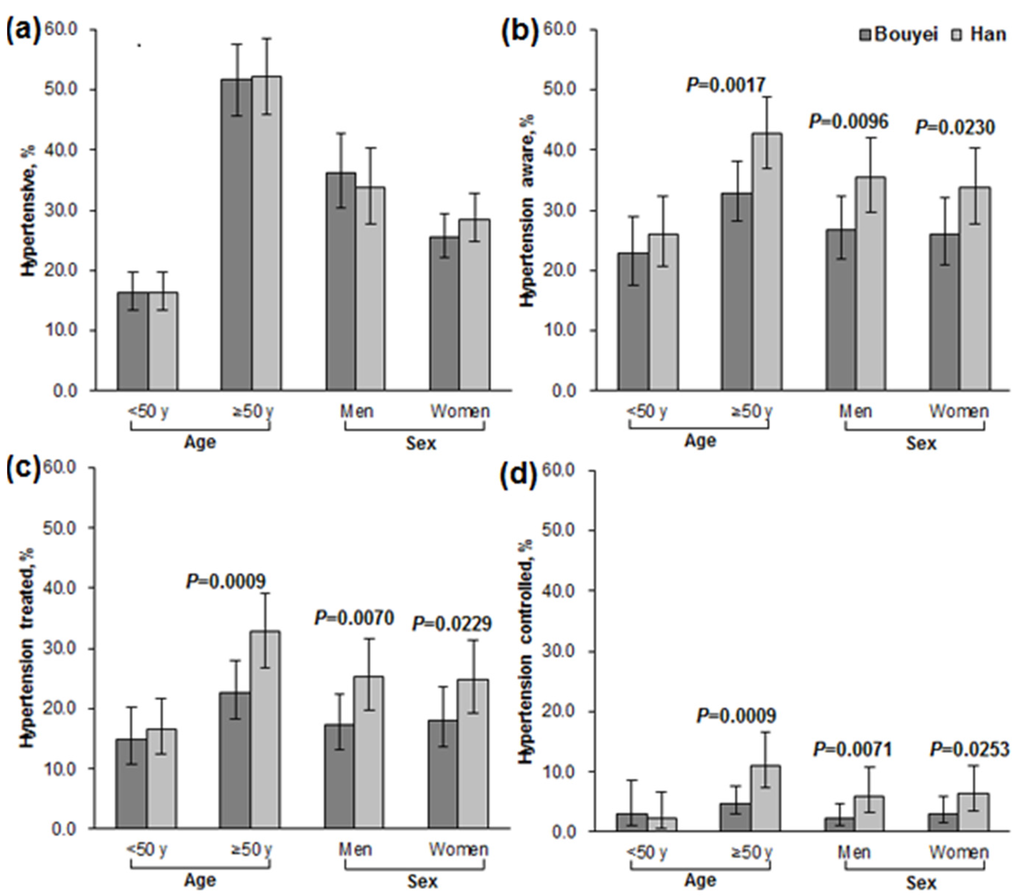 Comparing adjusted prevalence, awareness, treatment, and control by Age and Sex. Error bars indicate limits of 95% CI. (a) Adusted prevalence of hypertension in Bouyei and Han; (b) Adjusted rates of awareness in hypertensive Bouyei and Han; (c) Adjusted rates of treatment in hypertensive Bouyei and Han; (d) Adjusted rates of control in hypertensive Bouyei and Han.