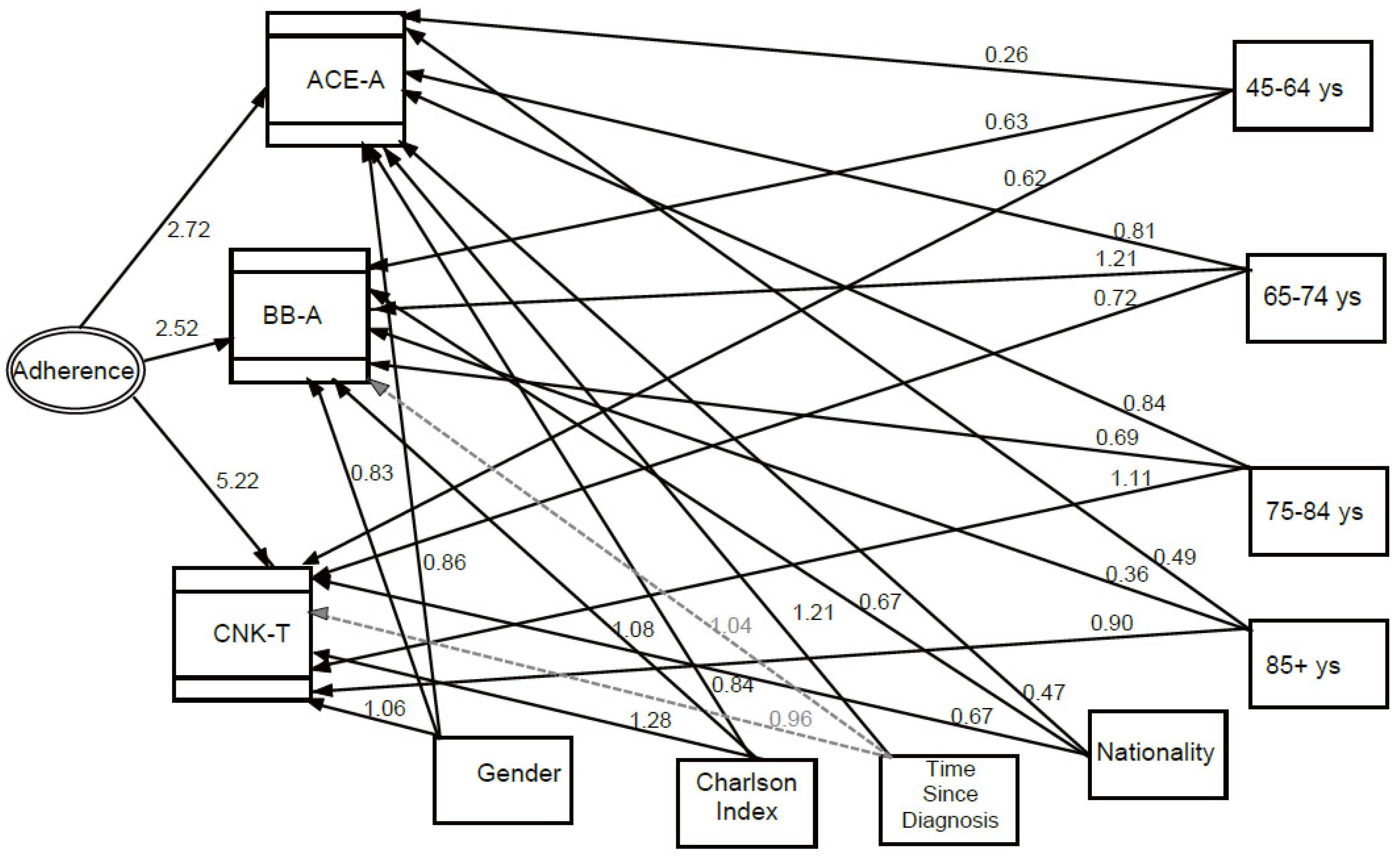 Multilevel structural equation model (SEM) with estimates of the parameters expressed as exponential functions of the regression coefficients (odds ratios). Direct effects are represented. Dashed grey lines stand for non-significant odds ratio paths, solid lines for significant odds ratio paths. (ACE-A = Therapy with ace-inhibitors or angiotensin-receptor blockers; BB-A = Therapy with Beta-Blockers; CNK-T = Creatinine, Sodium and Potassium Test).