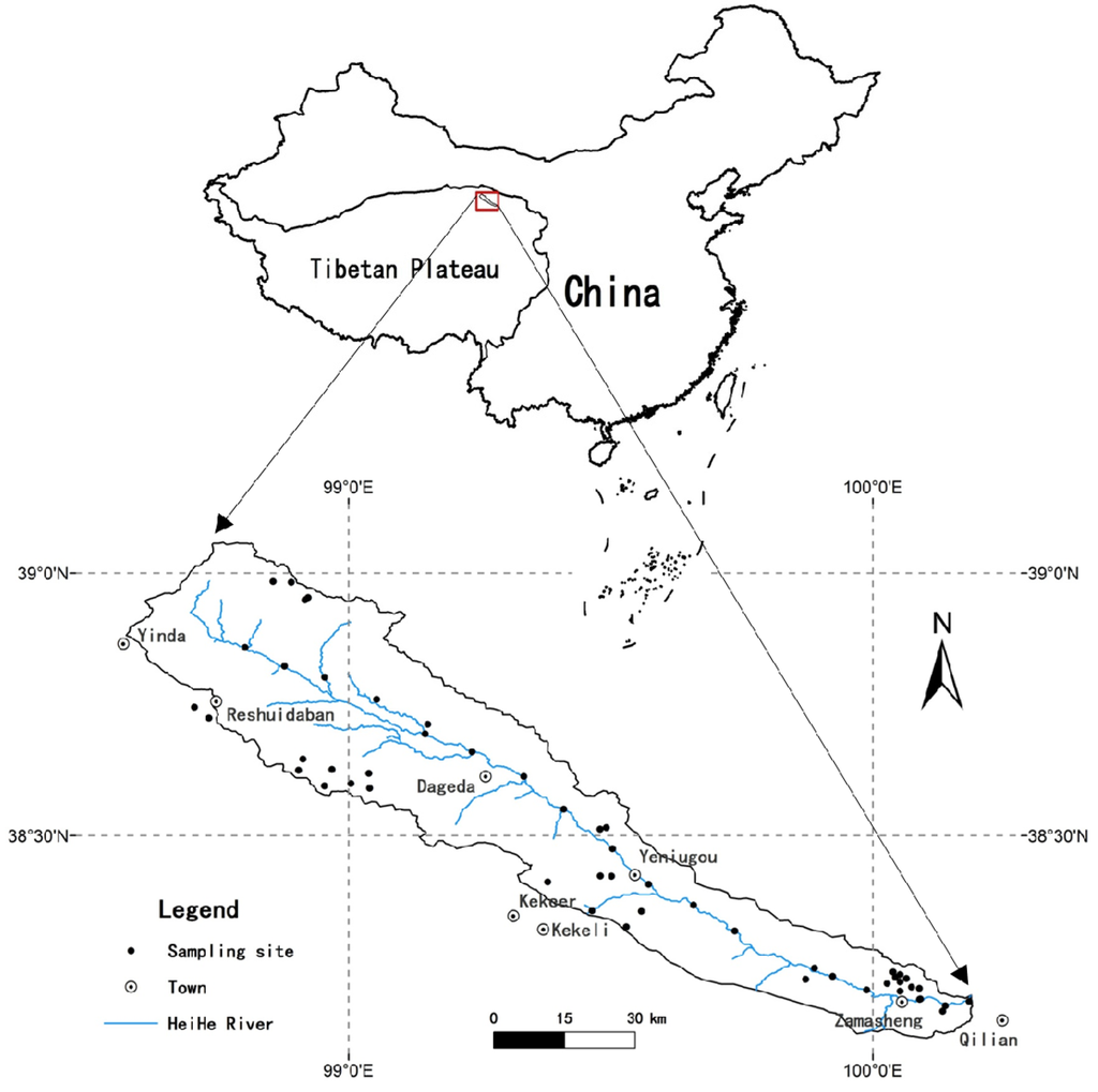 The Tibetan Plateau and surrounding mountains are referred to as the “Third Pole of the World” due to their high altitude (over 4000 m), large territory (more than 3 million km2) and unique geographical position and climate [25,26]. The Tibetan Plateau is also called the “Water Tower of Asia” because it is the source region for over 10 of the largest rivers in Asia, including the Yangtze River, the Yellow River, the Brahmaputra River, the Ganges River and the Indus River, which provide water resources for approximately 40% of the World’s population [27]. Among these rivers, the Heihe River is the second largest inland river in China, originating in the Qilian Mountains (Qinghai Province in the northeast Tibetan Plateau) and flowing through an area of ~130,000 km2 before terminating in Juyanhai Lake (Inner Mongolia in the southwest Mongolian Plateau) [28].