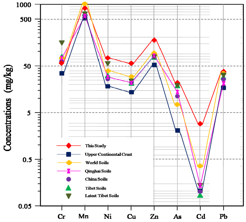 In this study, the concentrations of Mn, Ni, Cu, Zn, As, Cd and Pb have been found to be elevated in the upper reaches of the Heihe River. All seven HMs are above the background levels compared with the soils of the world, China, Tibet and Qinghai Province. Chromium (Cr) is the only metal showing lower concentrations than the reference soils, while Cd is highly elevated compared to the reference samples. The high Cd background concentration is due to well-preserved limestone, distinctive ore-forming geological conditions and the geochemical background. HMs in soils mainly originated from the weathering of underlying bedrocks. However, anthropogenic activities, such as geological exploration and mineral resources exploitation, may expedite the weathering process.