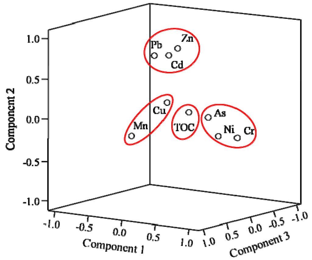 Rotated component matrix for 8 HM concentrations and TOC content.