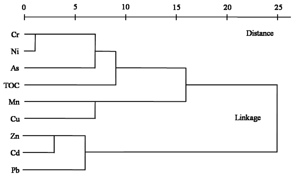 CA was applied to the standardized bulk concentration data using Ward’s method. Euclidian distances were used as the criterion for forming clusters of HMs and TOC. A tree diagram, which was generated from Figure 4, displays four clusters: (1) Cr–Ni–As, (2) TOC, (3) Mn–Cu and (4) Zn–Cd–Pb. Clusters (1), (2), (3) and (4) reflect F1, F4, F3 and F2 in the PCA respectively, and the large distance between TOC and other clusters suggests that the TOC may have confined connections with specific metals. The four clusters have strong relations with the four PCA factors, further confirming the reliability of the PCA results and suggesting a common source from nature.