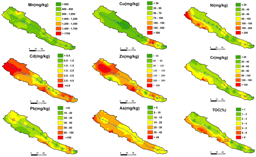 The interpolated concentration maps of HMs and TOC are presented in Figure 5. Manganese (Mn) and Cu have similar distribution patterns. High levels of the two HMs, indicated by orange and red colors on the maps, were only found in a small localized area. Clastic sediments, as well as other sedimentary and metasedimentary rocks, are well distributed in the upper reaches of the Heihe River. Shales, limestones and mudstones from the bedrocks potentially contain relatively high concentrations of Mn and Cu [82,83]. These two HMs in soils should originate from the weathering of parent rocks. In other areas, the interpolated concentrations were all similar to the average world background level. Based on this analysis, these two HMs, particularly Mn, are considered to be relatively conservative elements.