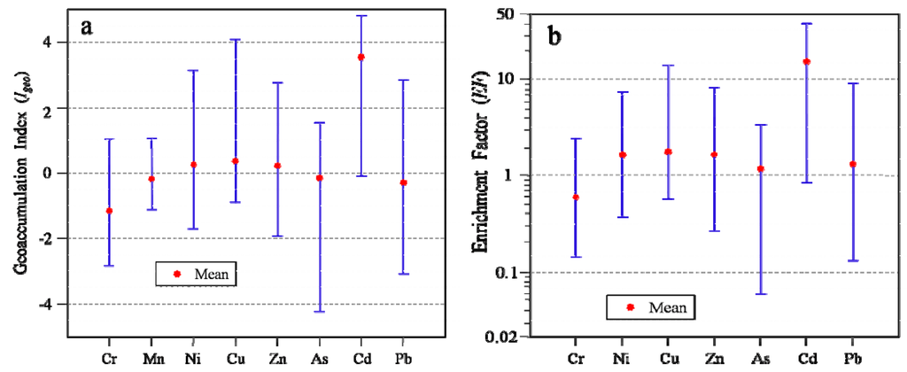 Mean, maximum and minimum values of (a) geoaccumulation index and (b) enrichment factor of HMs.