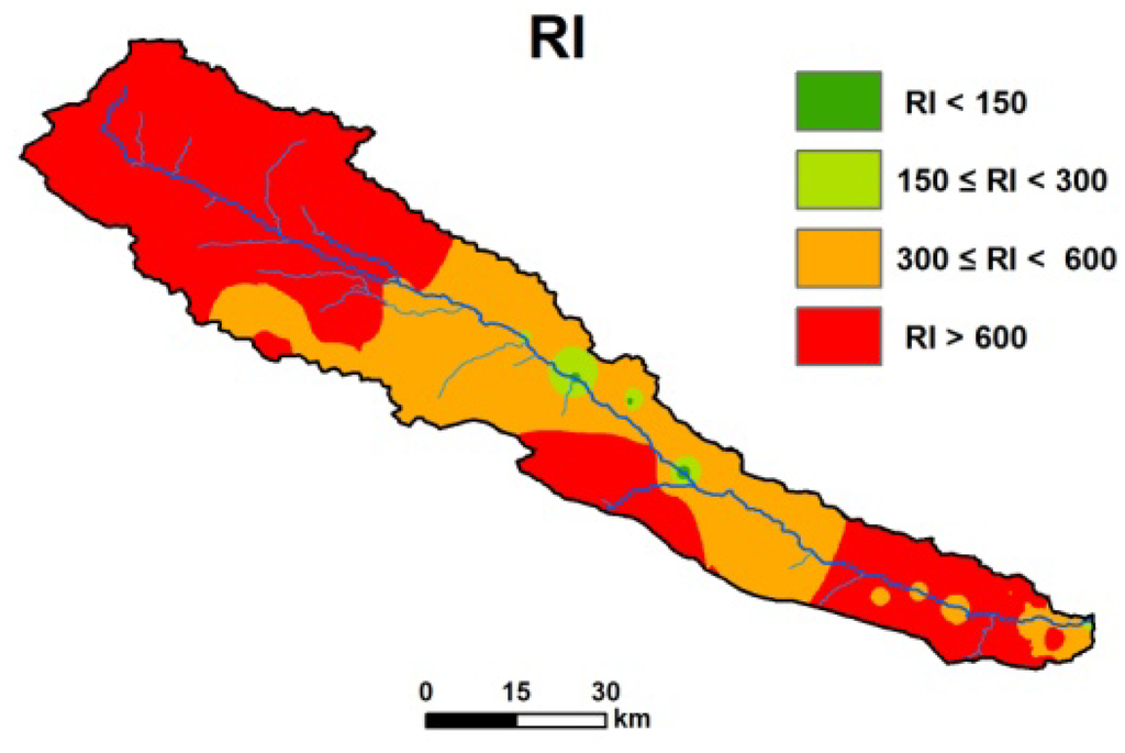 Apart from single metal risk assessments, an RI calculation was also employed, to provide information about the regions with potential ecological risk in the upper reaches of the Heihe River. The interpolated RI map (Figure 7) displays a similar spatial distribution to that for the concentration of Zn in the northwest, middle and southeast of the study area. In other parts, Cd, whose concentration exceeds the background content to the largest extent, dominates the pattern of the RI map. The dark red and orange areas represent medium to high risk (RI value > 300) and cover almost all territory in the upper reaches of the Heihe River. The highest risk regions are located in the northwest (the entire area from Yinda to Reshui daban), the middle bottom (from Kekeer to Kekeli) and the southeast (around Zamasheng) of the study area. Fragmentary green spots only appear near Yeniugou and Dageda. The RI map presents integrated results after the simultaneous processing of different independent metals and yields a single result.