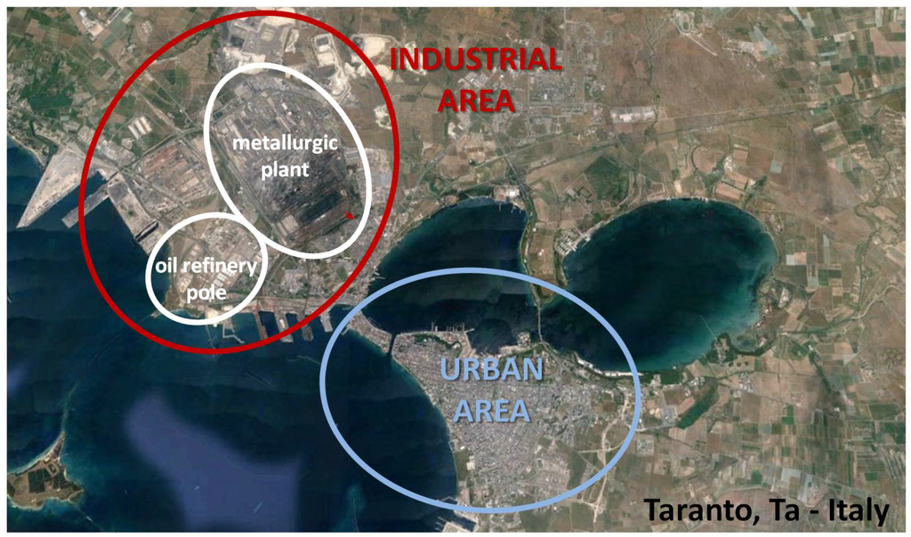 Summary map of Taranto city, with indication of industrial and urban areas of Taranto.