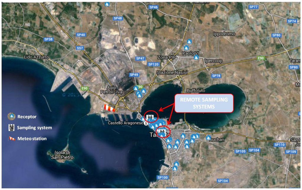 Location of receptors, remote sampling systems, and meteorological station on map of Taranto.