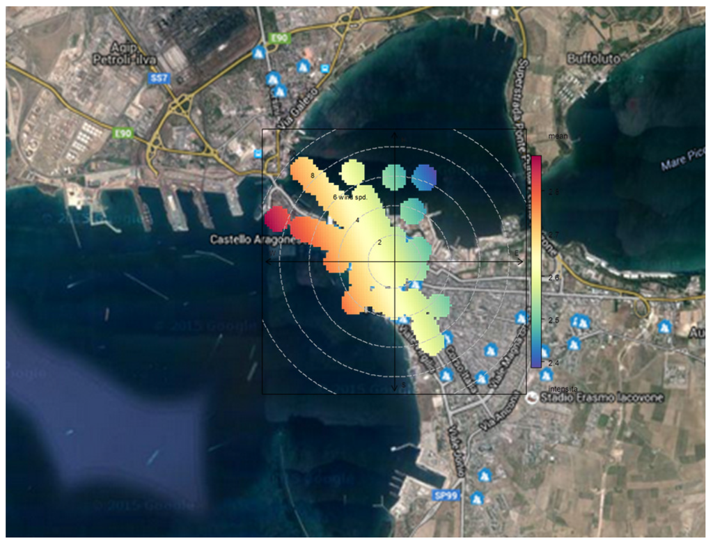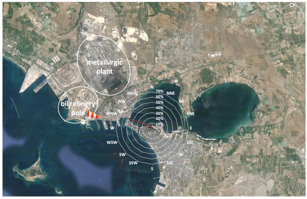 Figure 2 shows the location of receptors, remote sampling systems, and automatic weather station. In particular, the weather station is sited at the local Department of ARPA Puglia (ex Testa Hospital—Contrada Rondinella), near the refinery oil plant in the industrial area of Taranto. It is equipped with seven sensors for the measurement of specific parameters: temperature, relative humidity, precipitation, wind speed, wind direction, atmospheric pressure, and global solar radiation.